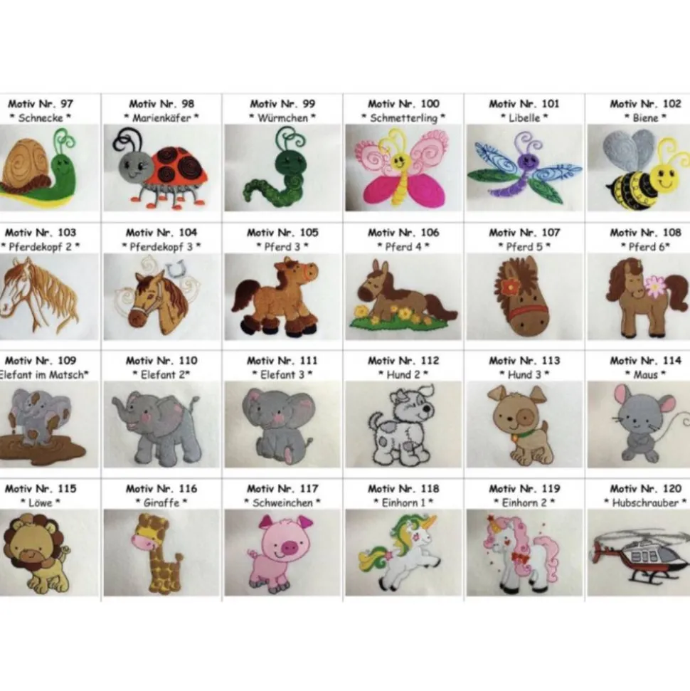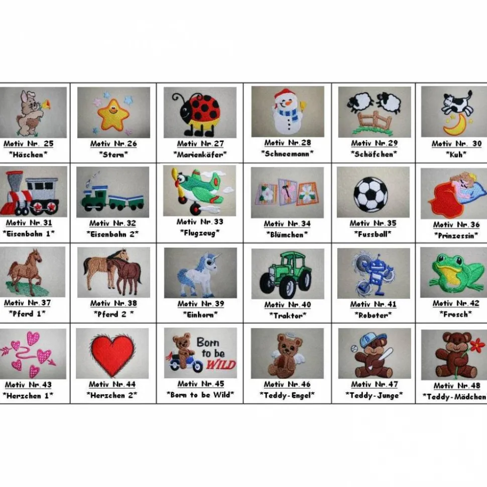Du kannst dir eins von den 120 abgebildeten Stickmotiven aussuchen und entscheidest dich für eine von den 4 Schriftarten für den Namen.