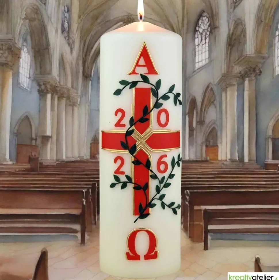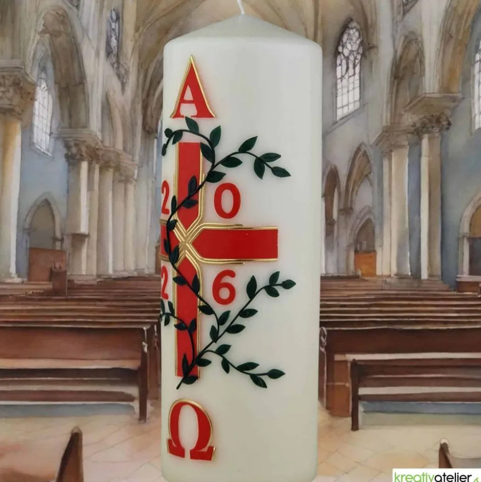 Die gold umrandete rote Kreuzverzierung auf der Kerze symbolisiert die Auferstehung Jesu Christi, die das zentrale Ereignis der christlichen Osterfeier ist. Die grüne Blumenranke, die das Kreuz umgibt, steht für Wachstum und Erneuerung und symbolisiert das Leben, das durch Christus möglich wird. Das Alpha und Omega auf der Kerze steht für den Anfang und das Ende und symbolisiert, dass Christus der Anfang und das Ende aller Dinge ist. Die aktuelle Jahreszahl auf der Kerze weist auf die Bedeutung von Ostern in diesem Jahr hin und macht die Kerze zu einem besonderen Erinnerungsstück.