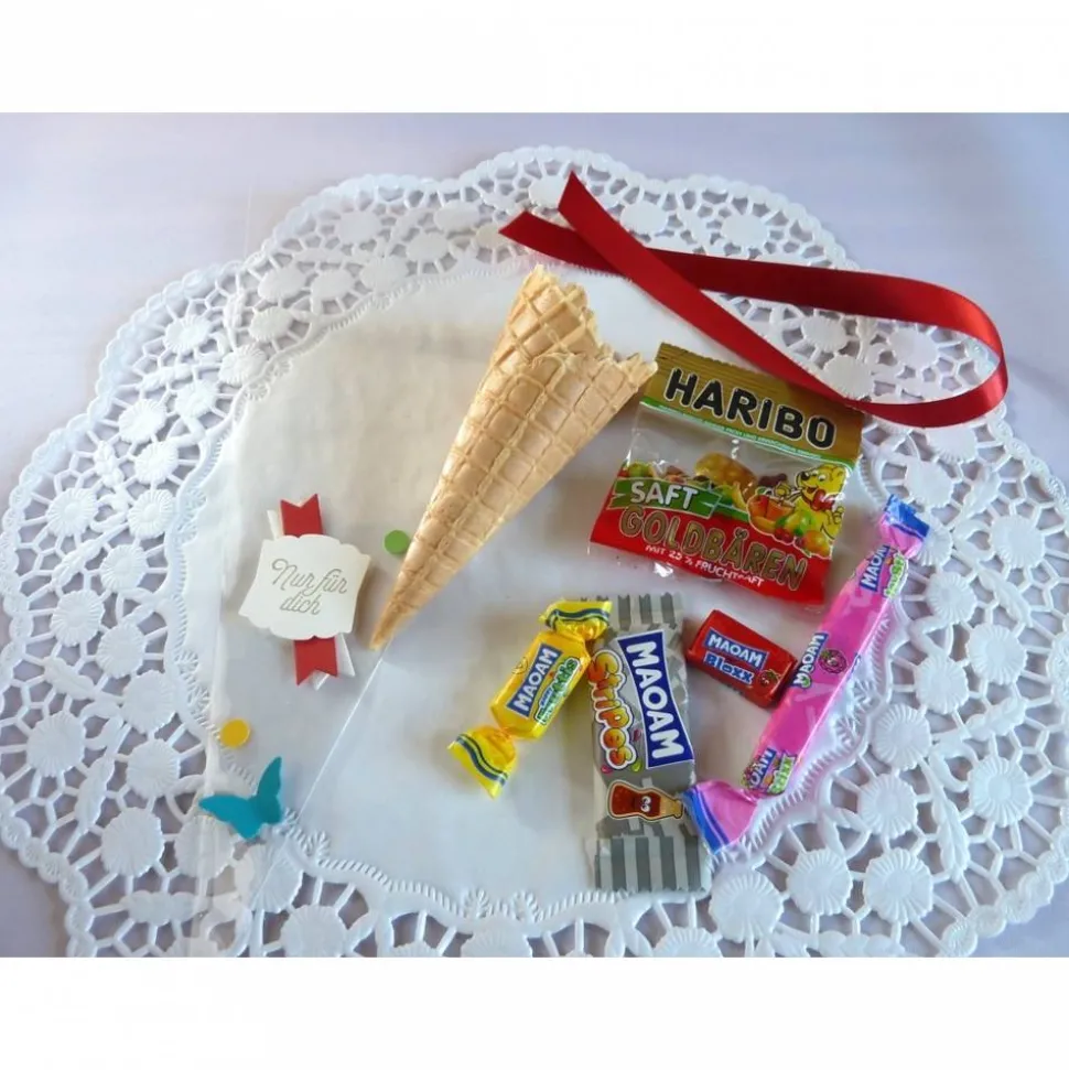 Cellophantüte, verschiedene Süßigkeiten, Eiswaffel, Satinband, Tonkarton, Stempelfarbe