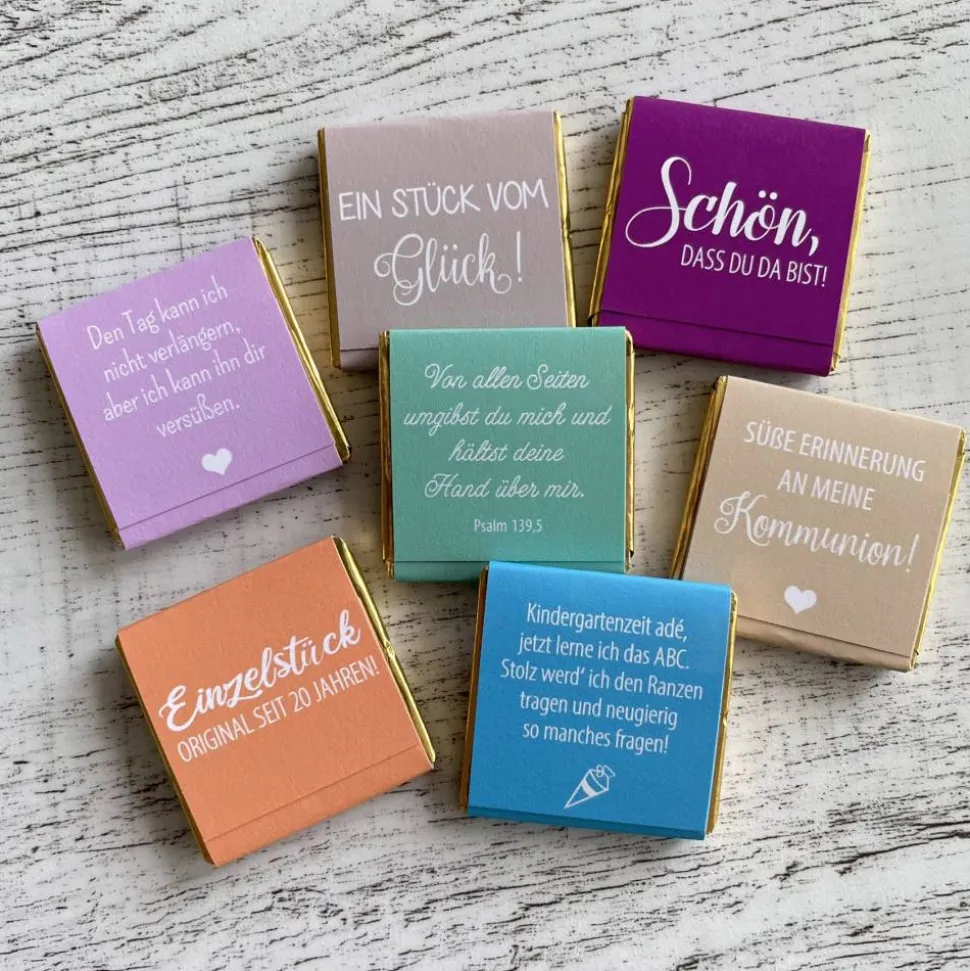 ♥ Geschmackssorten: Vollmilch, Zartbitter und Weiße Schokolade (Keine Sortenauswahl – die Täfelchen werden gemischt geliefert.)