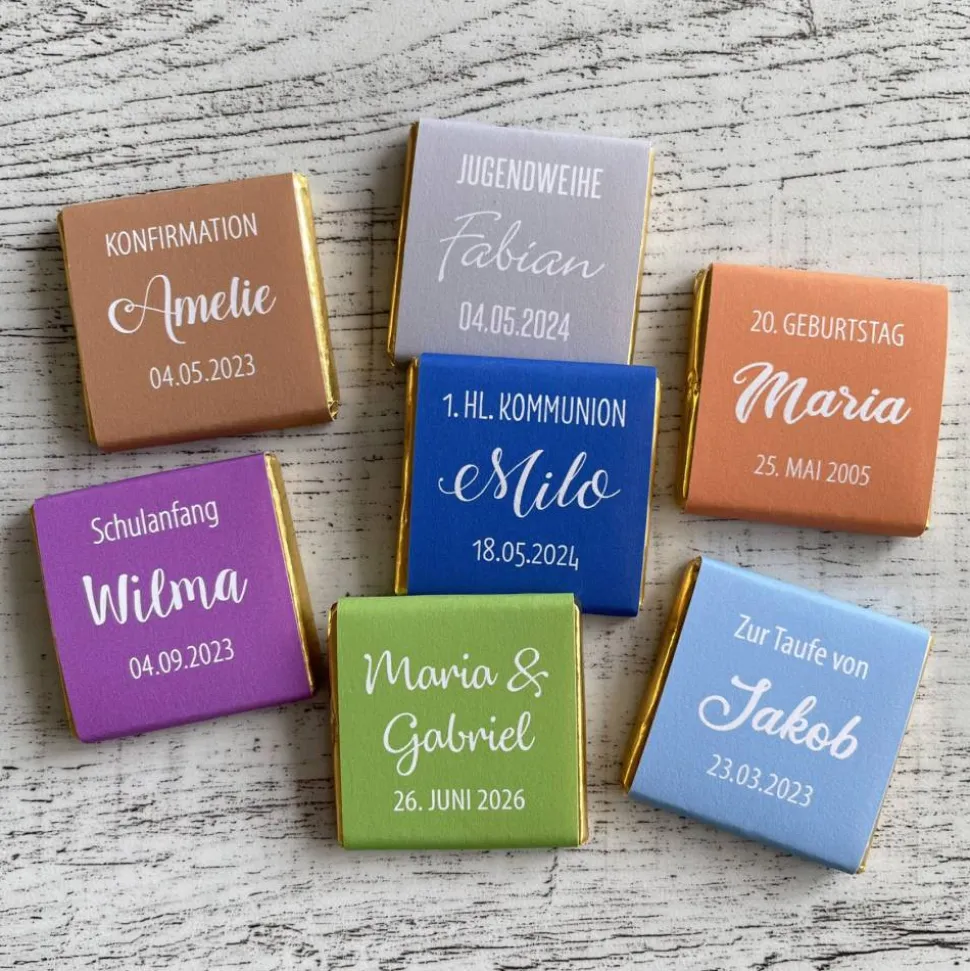 ♥ Geschmackssorten: Vollmilch, Zartbitter und Weiße Schokolade (Keine Sortenauswahl – die Täfelchen werden gemischt geliefert.)