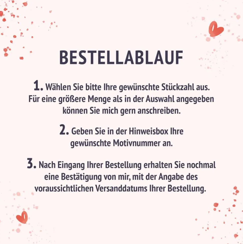 1. Wählen Sie bitte Ihre gewünschte Stückzahl aus. Für eine größere Menge als in der Auswahl angegeben können Sie mich gern anschreiben.