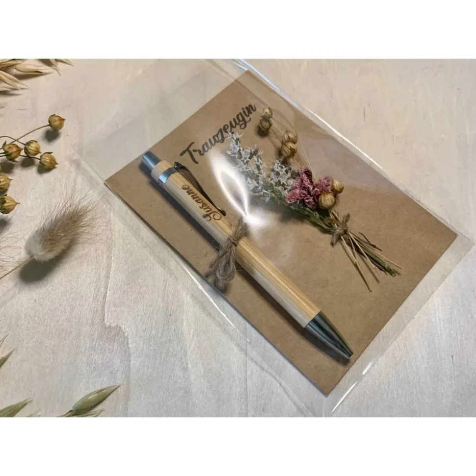 Der Kugelschreiber aus Bambus hat eine blaue Miene und wird ebenfalls nach deinem Wunsch graviert. Jede Karte wird zum Schutz der Trockenblumen einzeln in eine Klarsichtfolie geschoben.