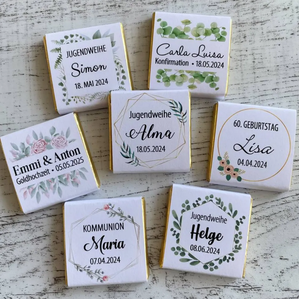 ♥ Geschmackssorten: Vollmilch, Zartbitter und Weiße Schokolade (Keine Sortenauswahl – die Täfelchen werden gemischt geliefert.)