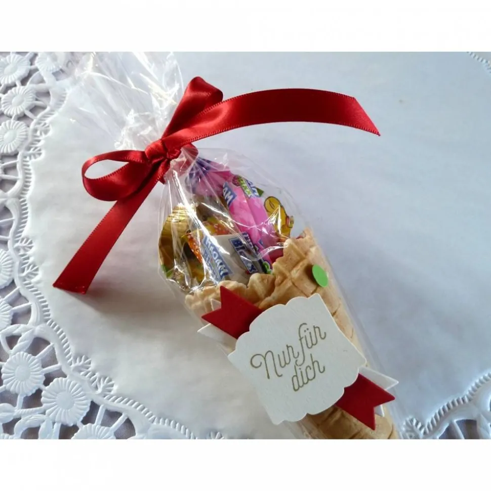Cellophantüte, verschiedene Süßigkeiten, Eiswaffel, Satinband, Tonkarton, Stempelfarbe