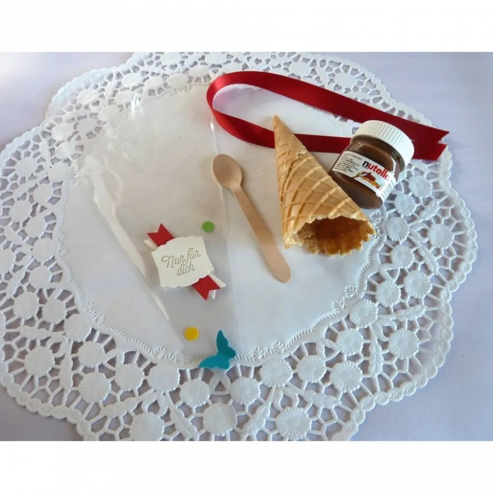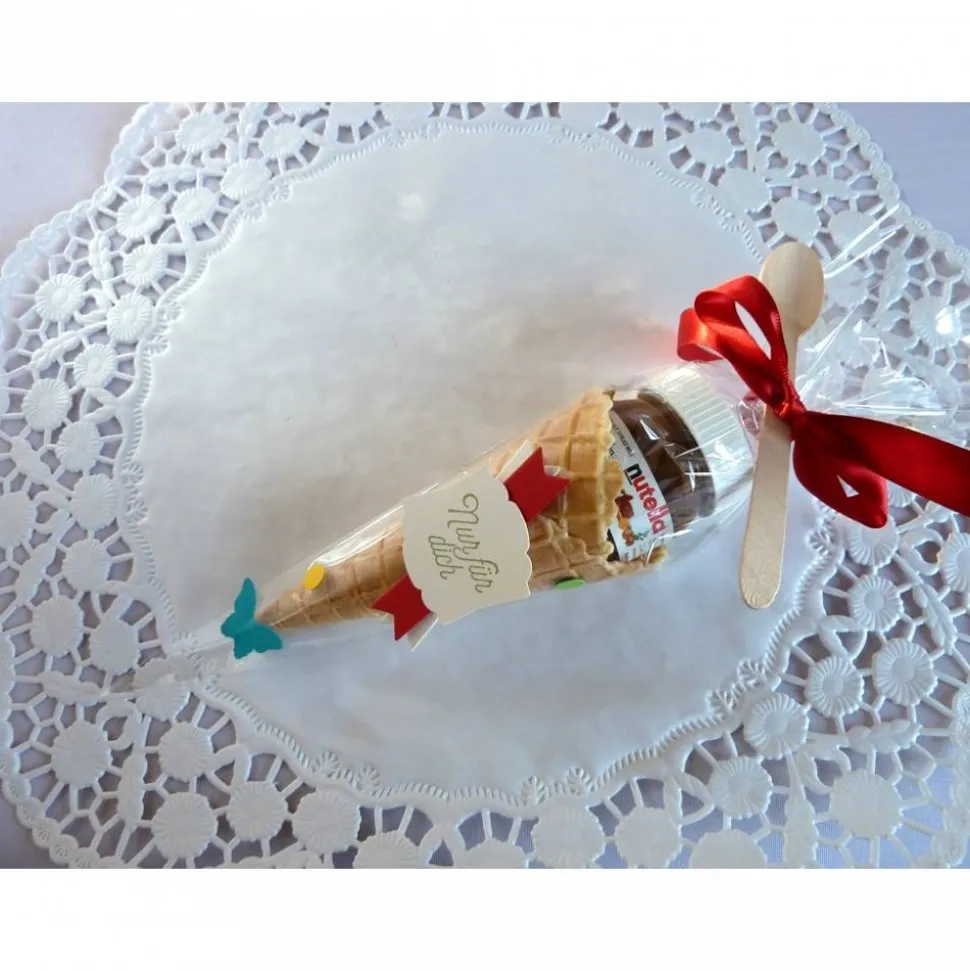 Cellophantüte, Nusscremegläschen, Holzlöffel, Eiswaffel, Satinband, Tonkarton, Stempelfarbe
