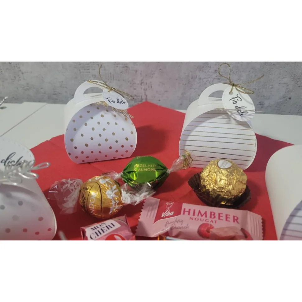 Ovale Schachteln in klein ca. 3,5 x 3,5 cm, Höhe ca. 3 cm oder ovale Schachteln groß ca. 5 x 5 cm, Höhe ca. 4 cm. Wahlweise in Gold/Silber mit Streifen/Punkten oder weiß mit Herzen in eurer Wunschfarbe gestempelt, weiß mit Zweigen und Herzen für die Hochzeitstafel/Konfirmation/Kommunion oder mit Konfetti/Girlanden für den Geburtstagstisch. Anhänger mit Name des Tischgastes oder Wahlweise mit DANKE, FÜR DICH, HALLO