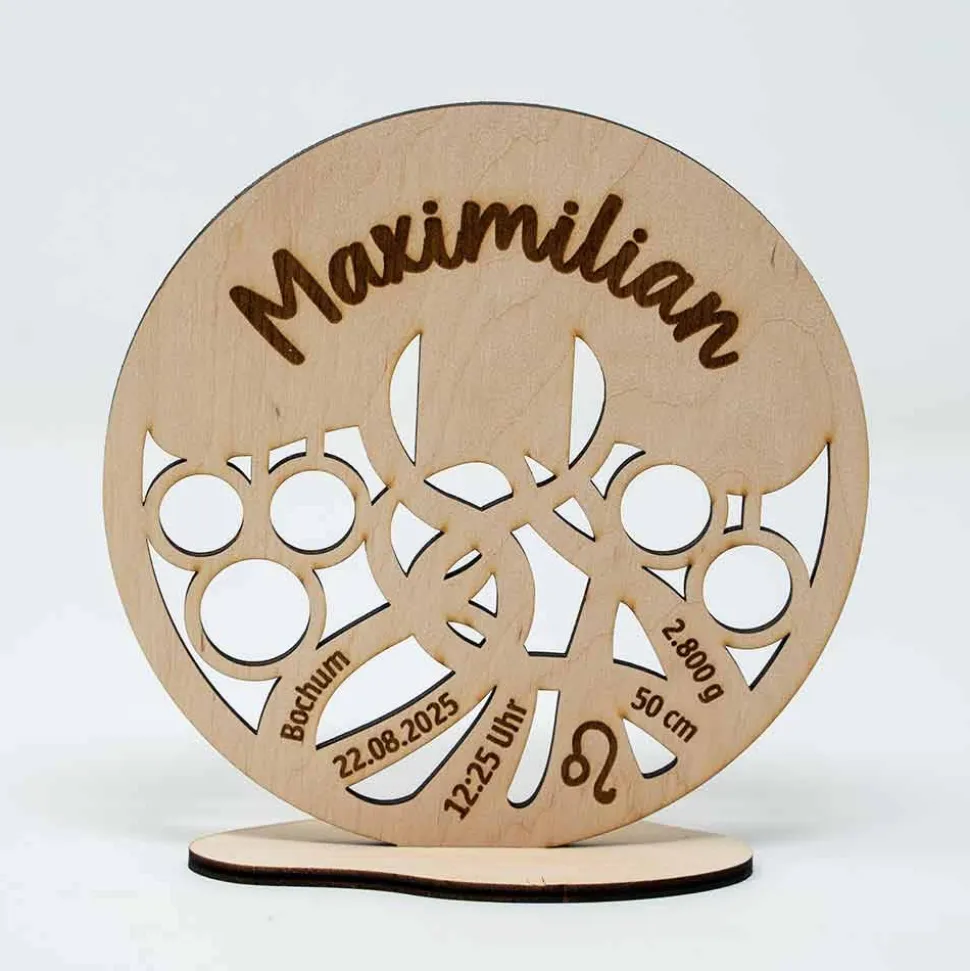 Mach den Baum einzigartig: Auf Wunsch gravieren wir alle wichtigen Details – Name, Geburtsdatum, Geburtszeit, Geburtsort, Sternzeichen, Größe und Gewicht. So wird der Baum zu einem ganz persönlichen Geschenk für das Kind und die Familie. Zusätzlich kannst du kleine Botschaften, Geldgeschenke oder Glückwünsche in die versteckten Aussparungen der Äste legen.