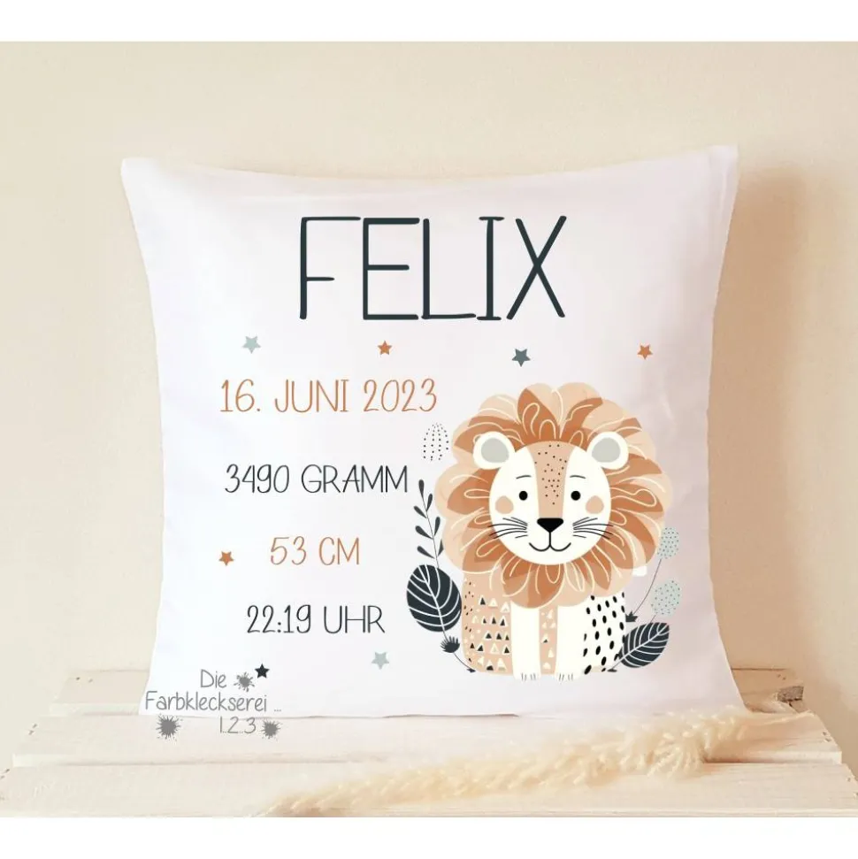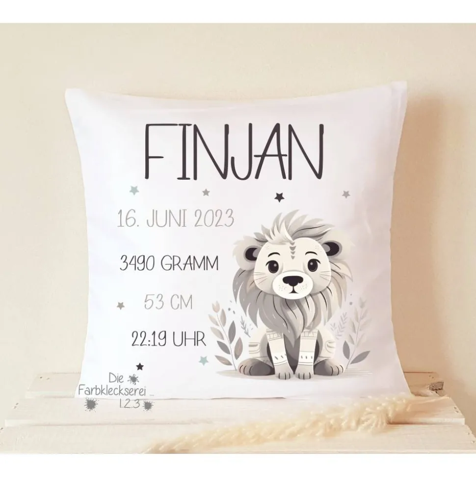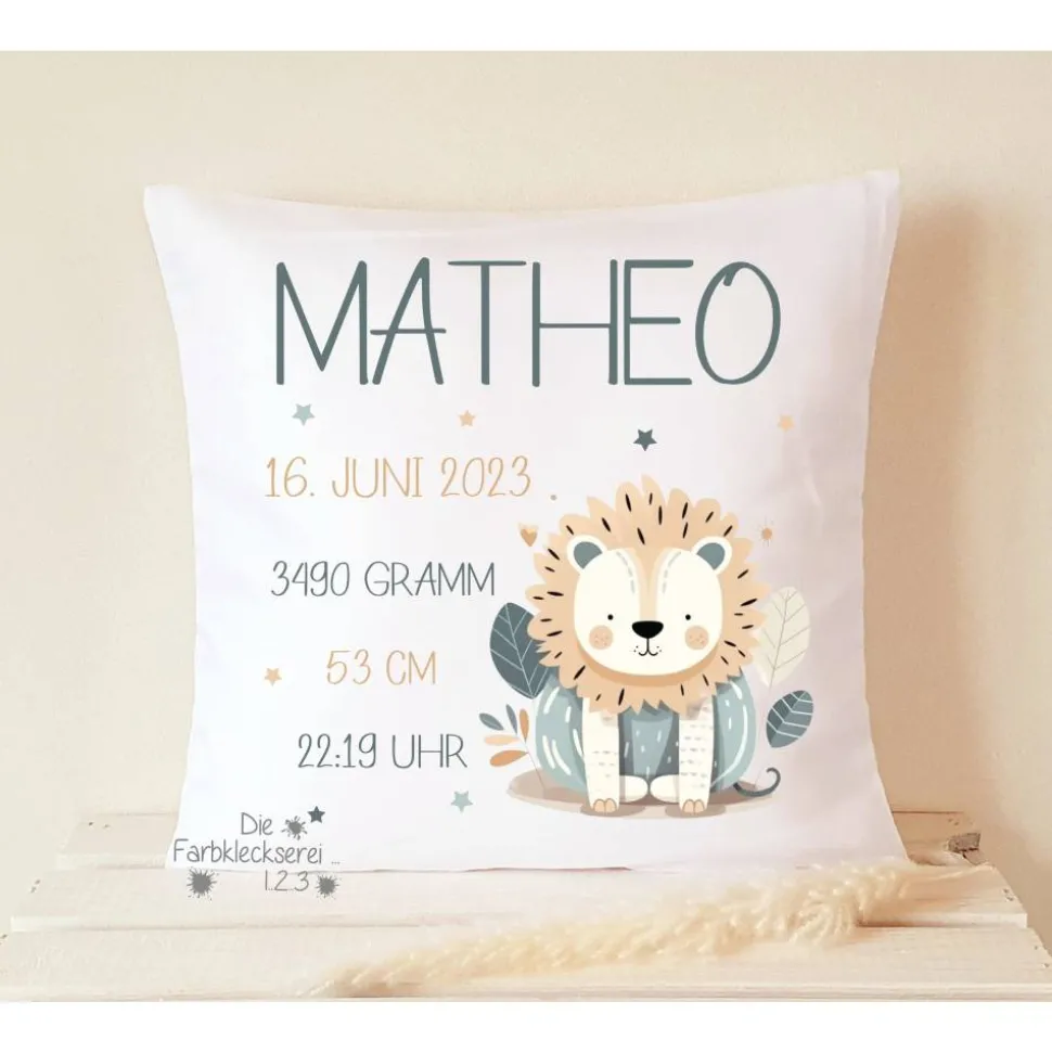 Vierziert wurde das Namenskissen mit einem kleinen Löwen.