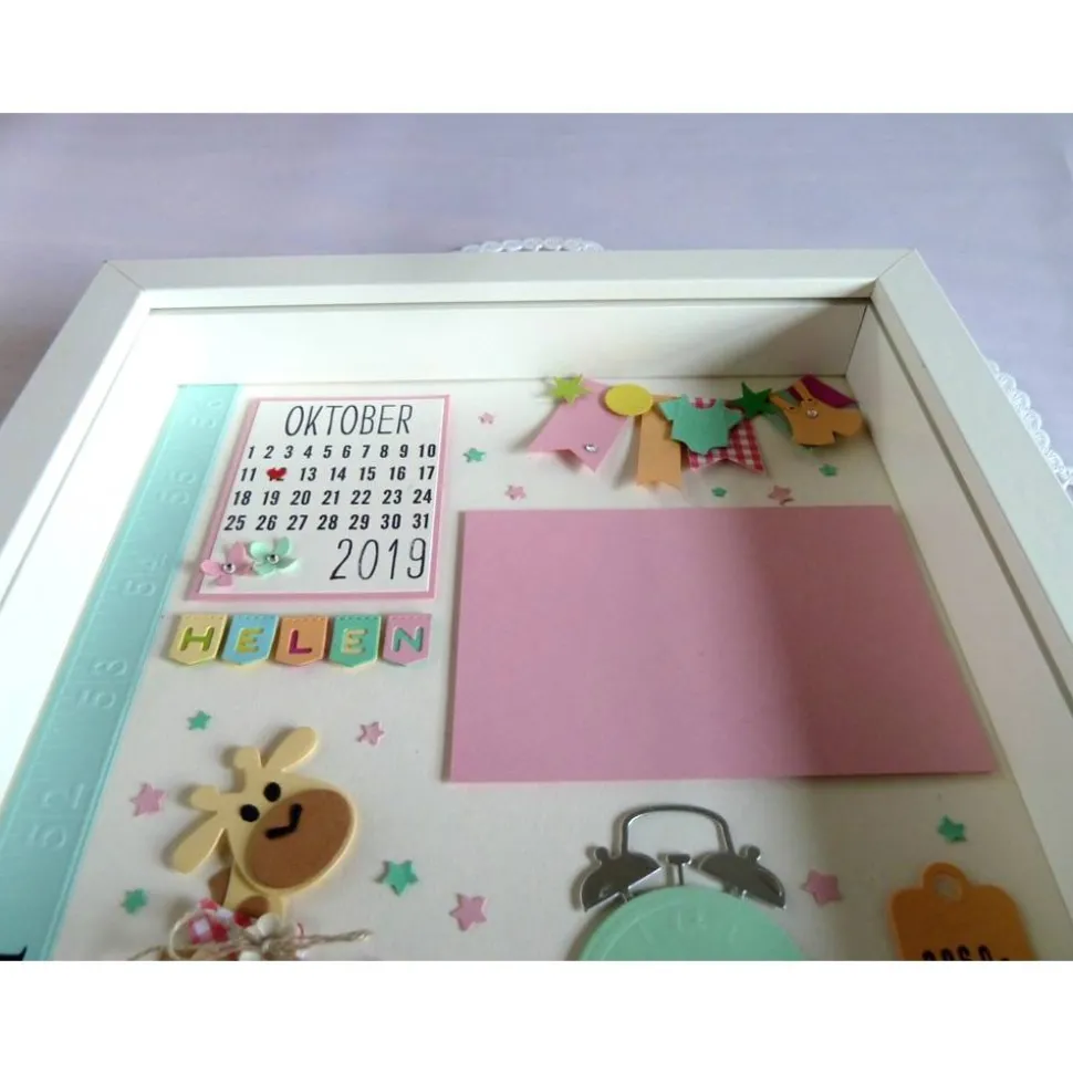 Für die Personalisierung benötige ich Name, Geburtsdatum, Größe, Gewicht und Uhrzeit. Auf das rosa Blankoteil auf der rechten Seite kann ein Foto aufgeklebt werden.