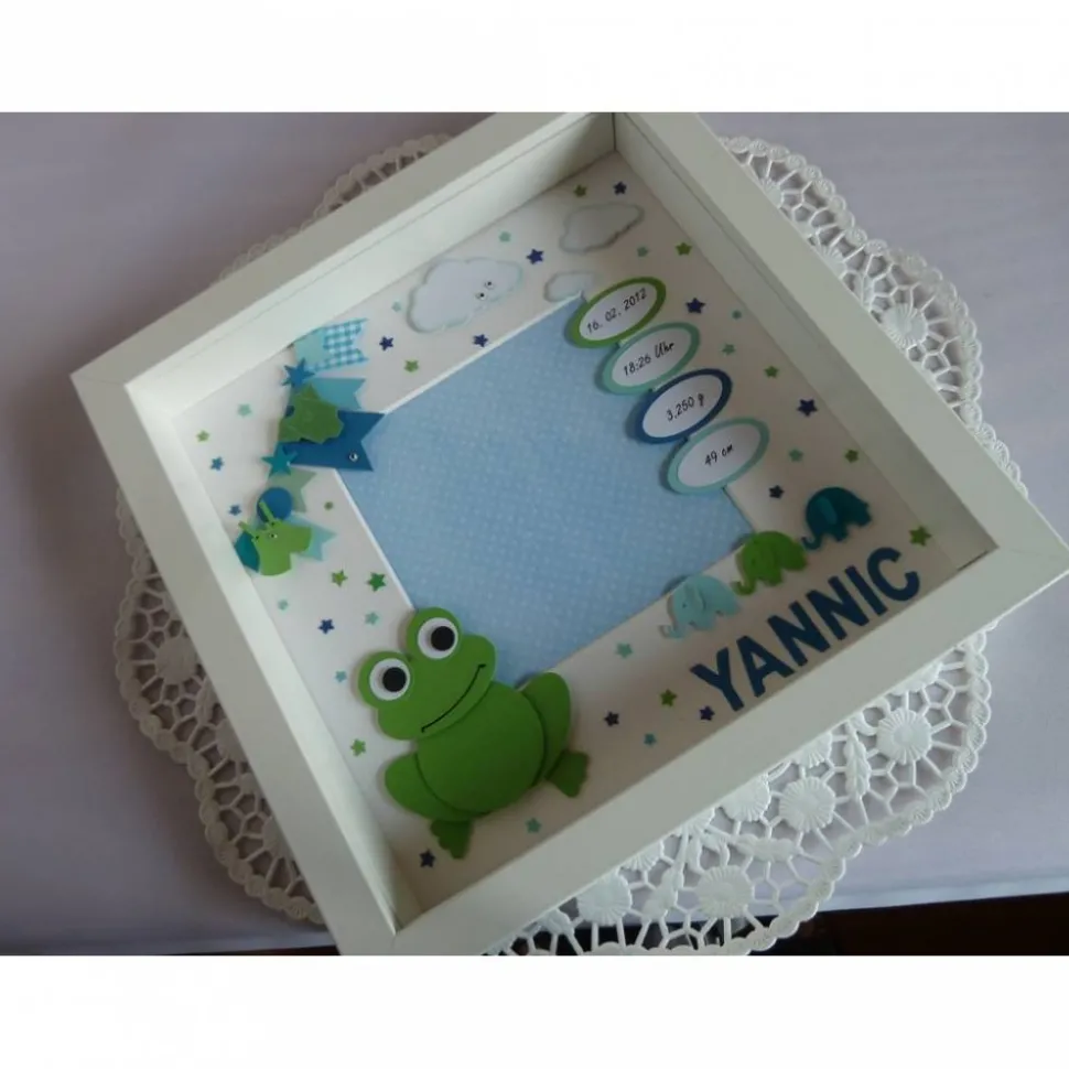 Schöner Bilderrahmen zur Geburt/Taufe, den ich individuell nach euren Wünschen mit den Geburtsdaten des neuen Erdenbürgers anfertige. Die Eltern des Neuankömmlings freuen sich bestimmt über dieses schöne Geburtsgeschenk, der Frosch ist der absolute Hingucker.