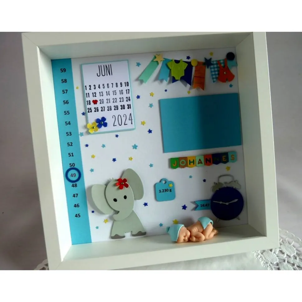 Die Eltern des Neuankömmlings freuen sich bestimmt über dieses schöne pesönliche Geburtsgeschenk, der kleine Elefant ist der absolute Hingucker.