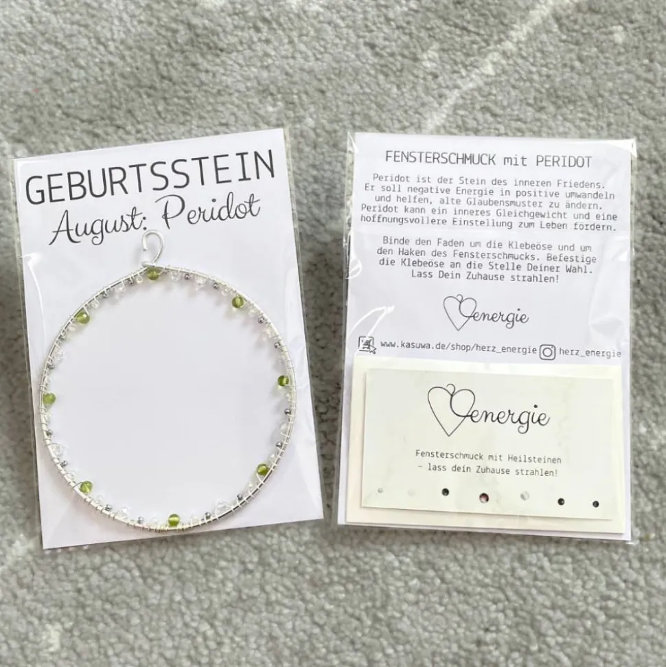 Zusätzlich zu dem Fensterschmuck steht auf der Vorderseite der Geburtsmonat und der Name des Geburtsteins. Auf der Rückseite kann man mehr über die Wirkung des verwendeten Edelsteins lesen. Es gibt auch eine Anleitung, wie man den Fensterschmuck am Fenster befestigt. In dem kleinen Umschlag befindet sich eine Klebeöse und durchsichtige Nylonfaden für das Aufhängen des Fensterschmucks.