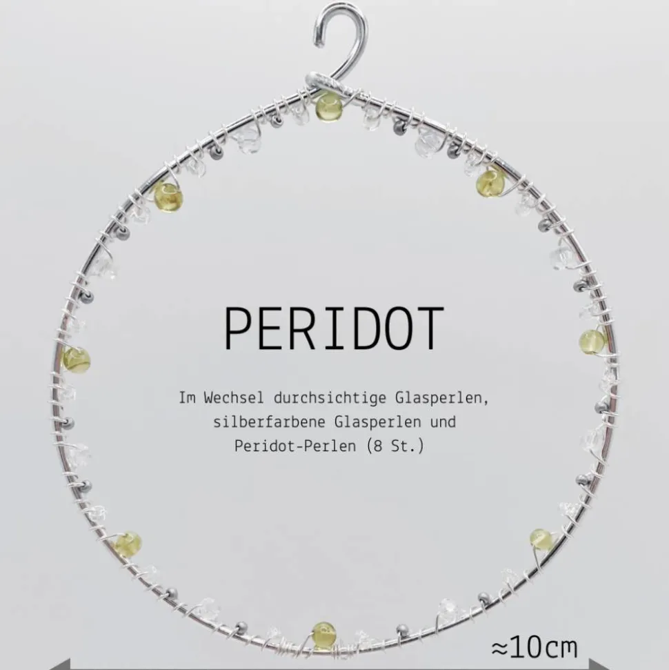 Dieser Fensterschmuck wird liebevoll als Handarbeit gefertigt. Jeder Kreis wird sorgfältig aus rostfreien Aluminiumdraht geformt und mit glänzenden Glasperlen und Energie spendenden Heilsteinen dekoriert. Jeder Fensterschmuck ist ein Unikat mit 8 Heilsteinen und einem Durchmesser von ungefähr 10 cm.