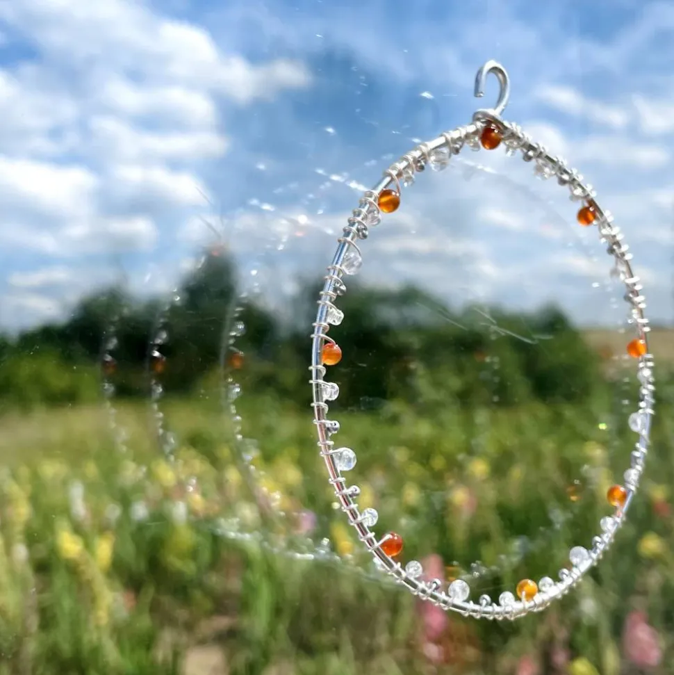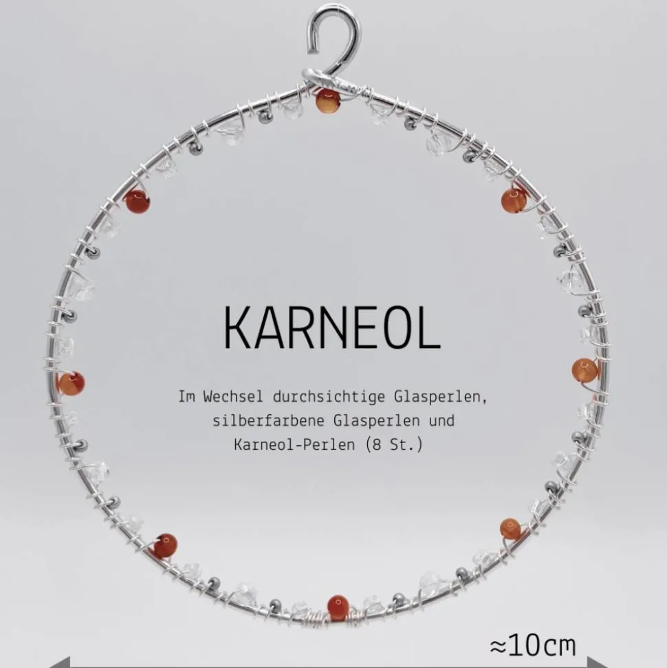 Dieser Fensterschmuck wird liebevoll als Handarbeit gefertigt. Jeder Kreis wird sorgfältig aus rostfreien Aluminiumdraht geformt und mit glänzenden Glasperlen und Energie spendenden Heilsteinen dekoriert. Jeder Fensterschmuck ist ein Unikat mit 8 Heilsteinen und einem Durchmesser von ungefähr 10 cm.