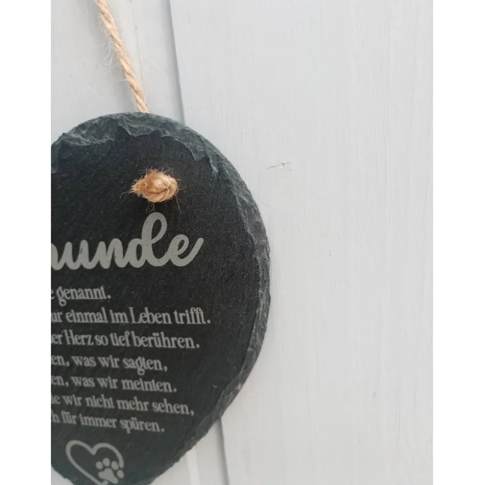 Die Platzierung des Textes variiert leicht, da ich die Gravur individuell an die Form und Bruchkanten jedes einzelnen Schieferherzens anpasse.