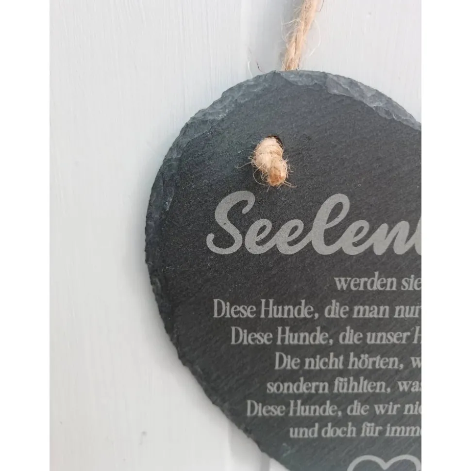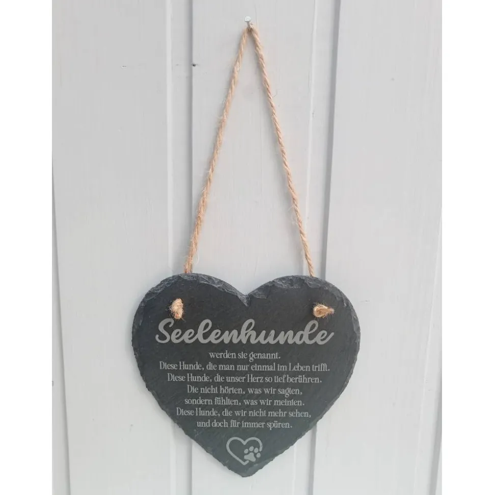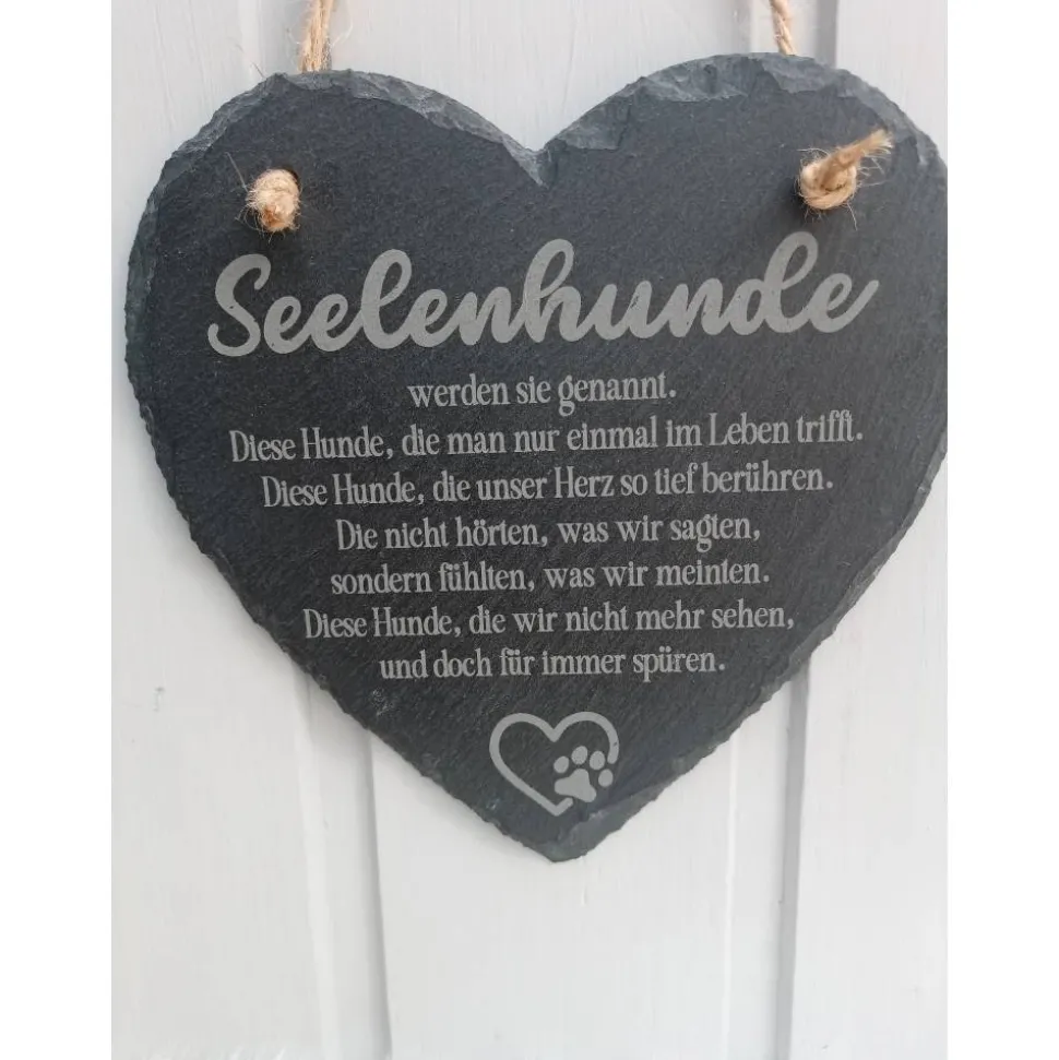 Dieses Herz trägt mit fein eingravierten Worten die Erinnerung an all unsere Seelenhunde – treue Gefährten, die unser Leben bereichern, uns ohne Worte verstehen und für immer einen Platz in unserem Herzen haben.