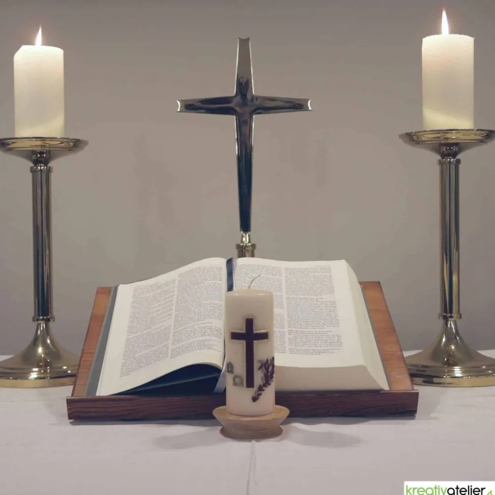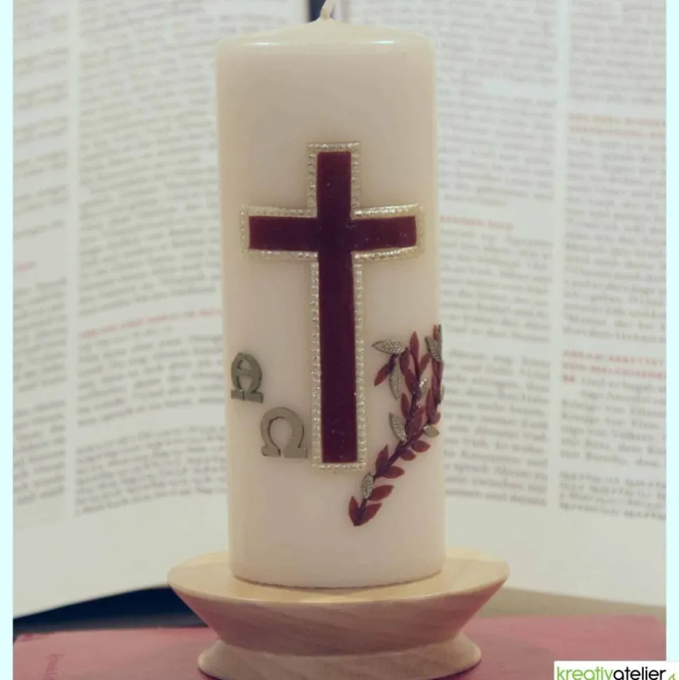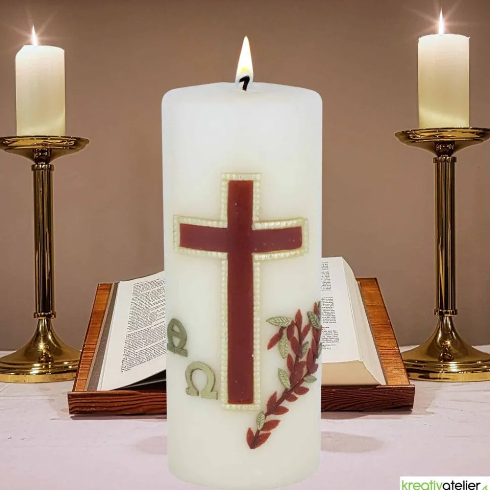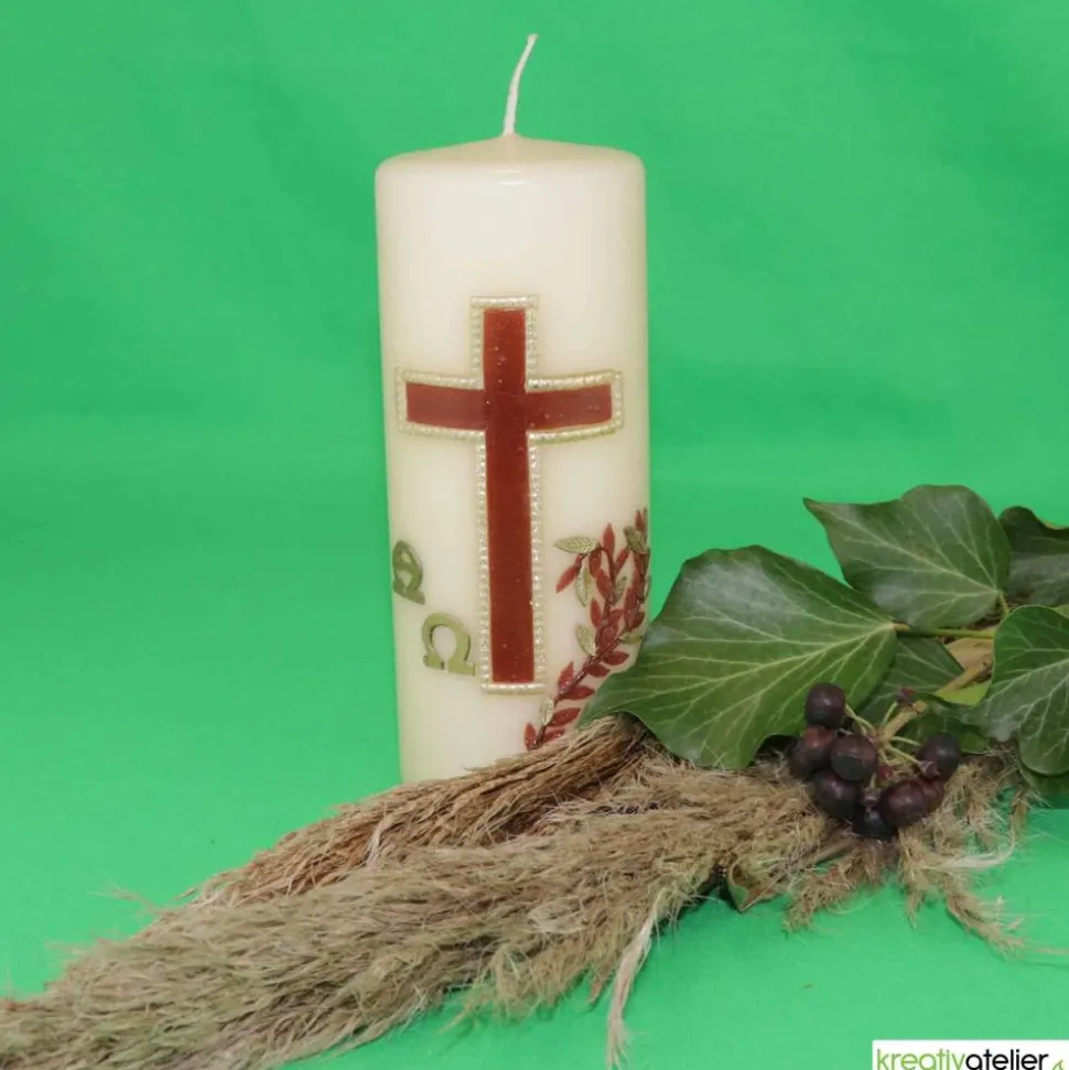 Die Kerze ist mit einem schlichten Kreuz in Gold und braunen Elementen verziert. Das Kreuz steht symbolisch für die Hoffnung und den Glauben, der in schweren Zeiten Trost spendet. Die goldenen Akzente verleihen der Gedenkkerze eine warme und würdevolle Ausstrahlung, die an den geliebten Menschen erinnert, dem sie gewidmet ist.