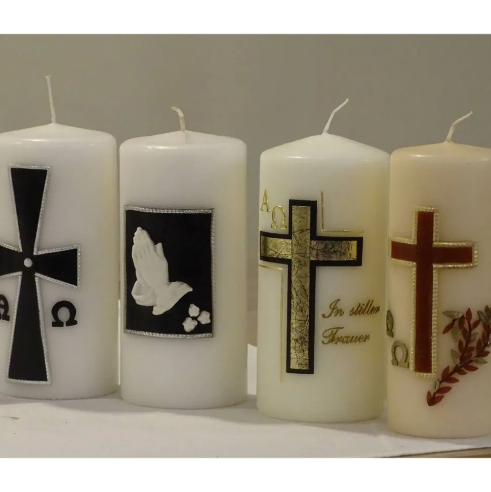 Alle Ornamente und Buchstaben werden einzeln von Hand aus verschiedenen Wachsplatten ausgeschnitten und kunstvoll auf der Gedenkkerze zu einem Gesamtbild arrangiert. Jede Trauererze ist somit einzigartig und ein Ausdruck der Liebe und des Gedenkens an den Verstorbenen.
