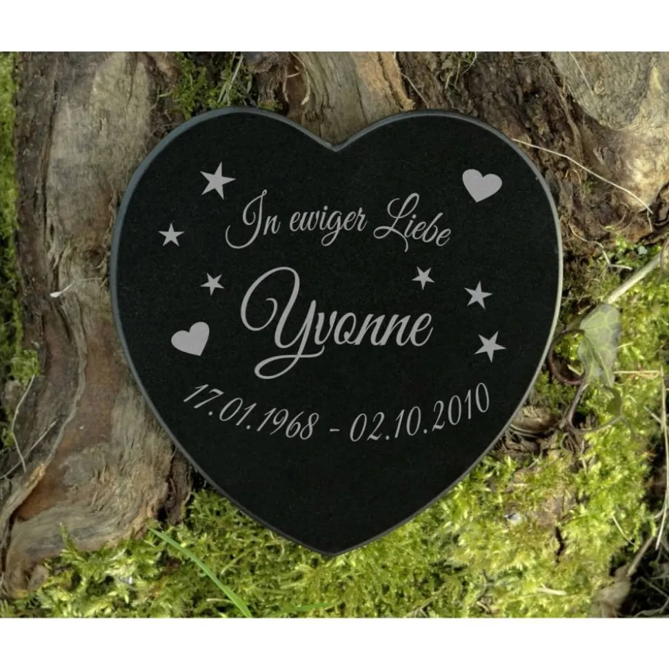 Diese edle Marmorplatte ist ein persönlicher Gedenkstein für einen lieben Verstorbenen. Das Herz mit persönlicher, silberfarben schimmernder Gravur aus hochglänzendem, polierten Marmor ist ein feiner Grabschmuck. Wen immer Sie schmerzlich vermissen: In unserer kleinen Manufaktur fertigen wir für Sie eine individuelle Gravur nach Ihren Wünschen mit dem Namen und Geburts- bzw. Todestag. Für Sternenkinder ist die Gravur nur eines Datums möglich.