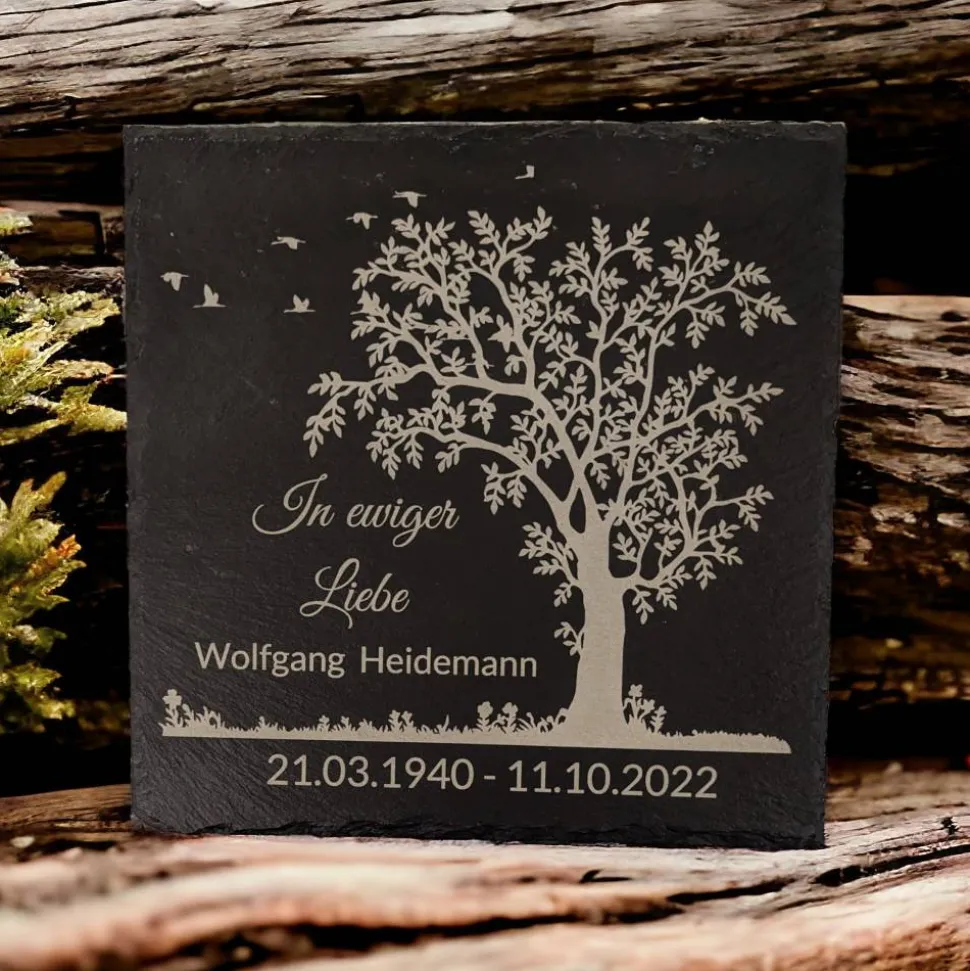 Die Schiefertafeln sind spalt Rauh, die Kanten sind behauen. Die Beschriftung wird mit dem Hochleistungslaser dauerhaft eingebrannt.