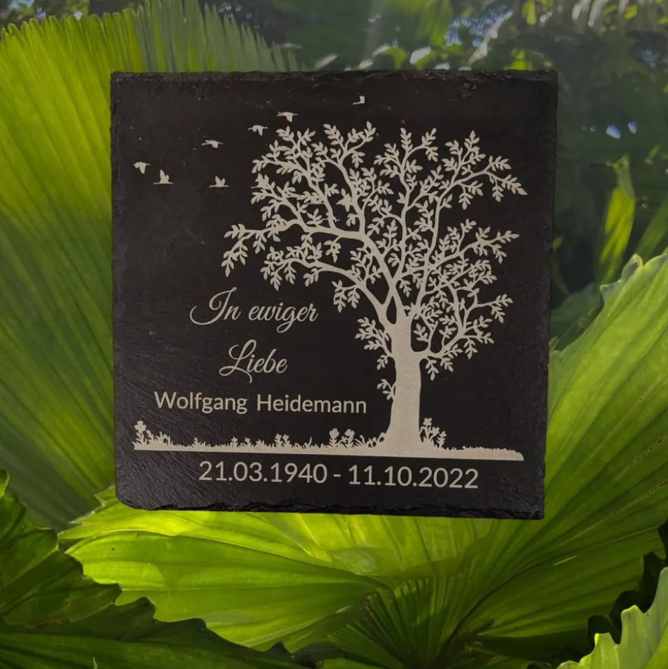 Bild und Schrift werden mittels modernsten Hochleistungs-Lasern fest im Schiefer eingebrannt. Die Grabplatte wird also nicht bedruckt oder beklebt. Die Gravur ist wetterbeständig und nutz sich auch bei dauerhafter Sonneneinstrahlung nicht ab.