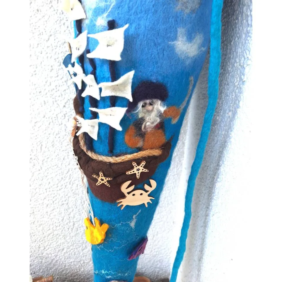 In sehr aufwändiger Detailarbeit habe ich diese Zuckertüte mit einem Piratenschiff gefilzt.
