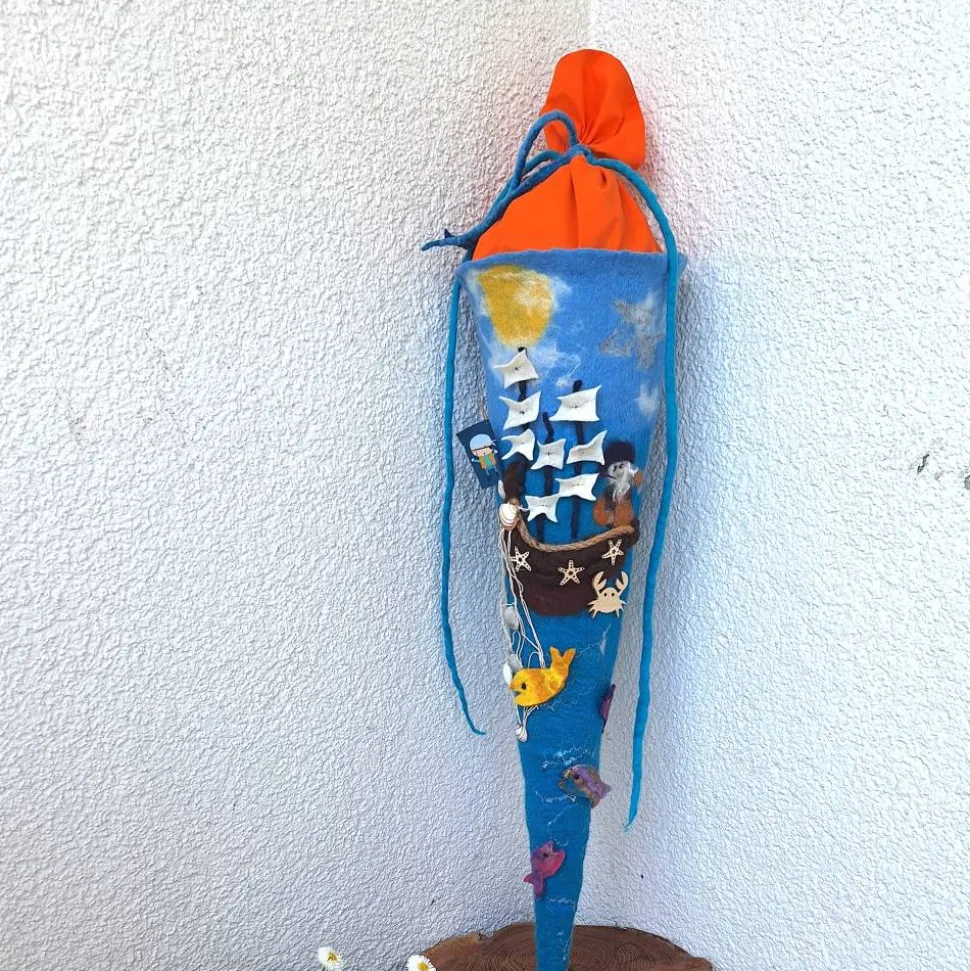Gefilzte Schultüte für den Schulanfang in origineller und sehr aufwendiger Gestaltung für kleine Abenteurer.