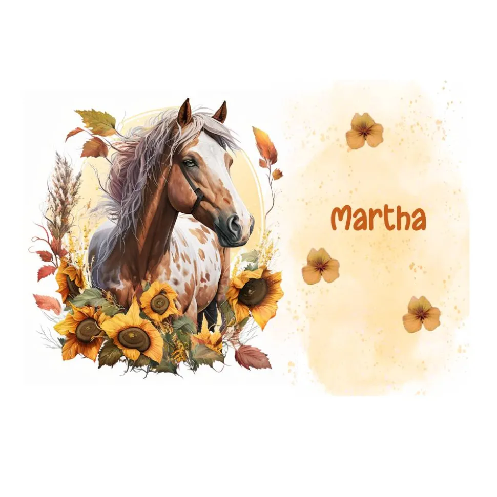 Hier mit einem braun-weißen Pferd, umgeben von Sonnenblumen. Rechts ein gelber Hintergrund mit Blüten und Platz für den Namen des Kindes.
