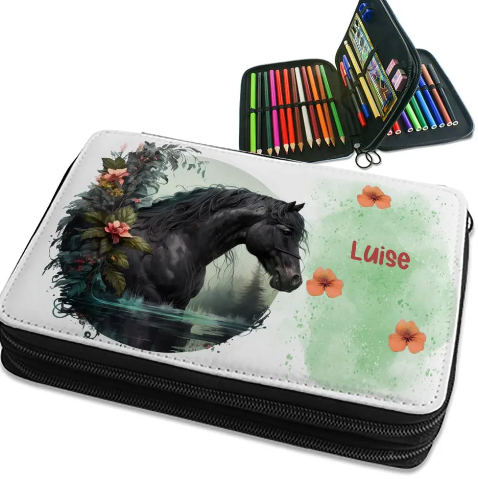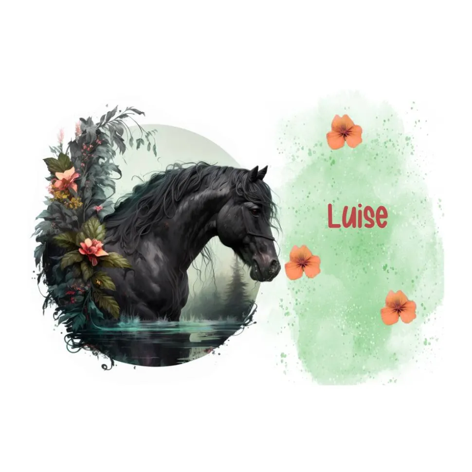Hier mit einem schwarzen Pferd im Wasser, umgeben von Blumen. Rechts ein grüner Hintergrund mit Blüten und Platz für den Namen des Kindes.