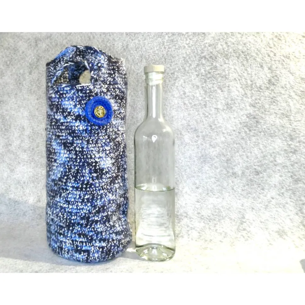 Diese hübsche Verpackung habe ich aus diversen Garnresten aus unterschiedlichen Materialien in Blau- und Weißtönen gehäkelt und mit einem hübschen, goldfarbenen Knopf dekoriert.