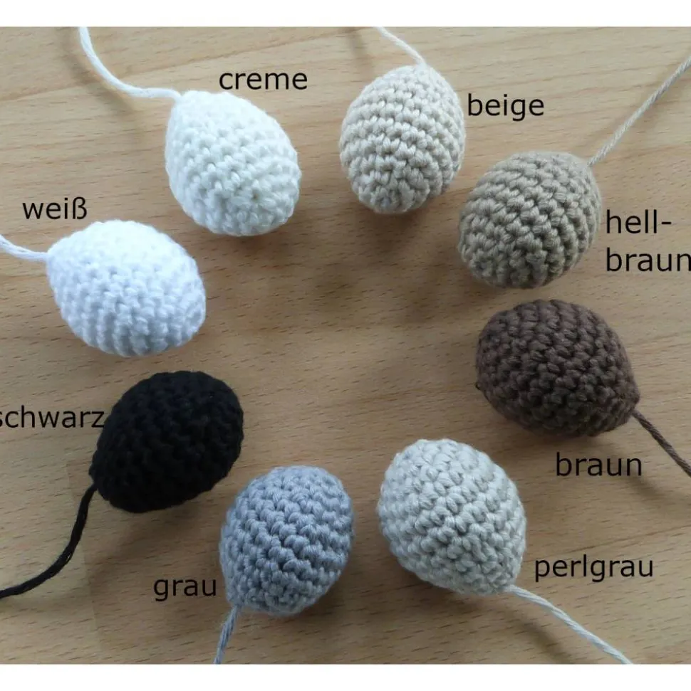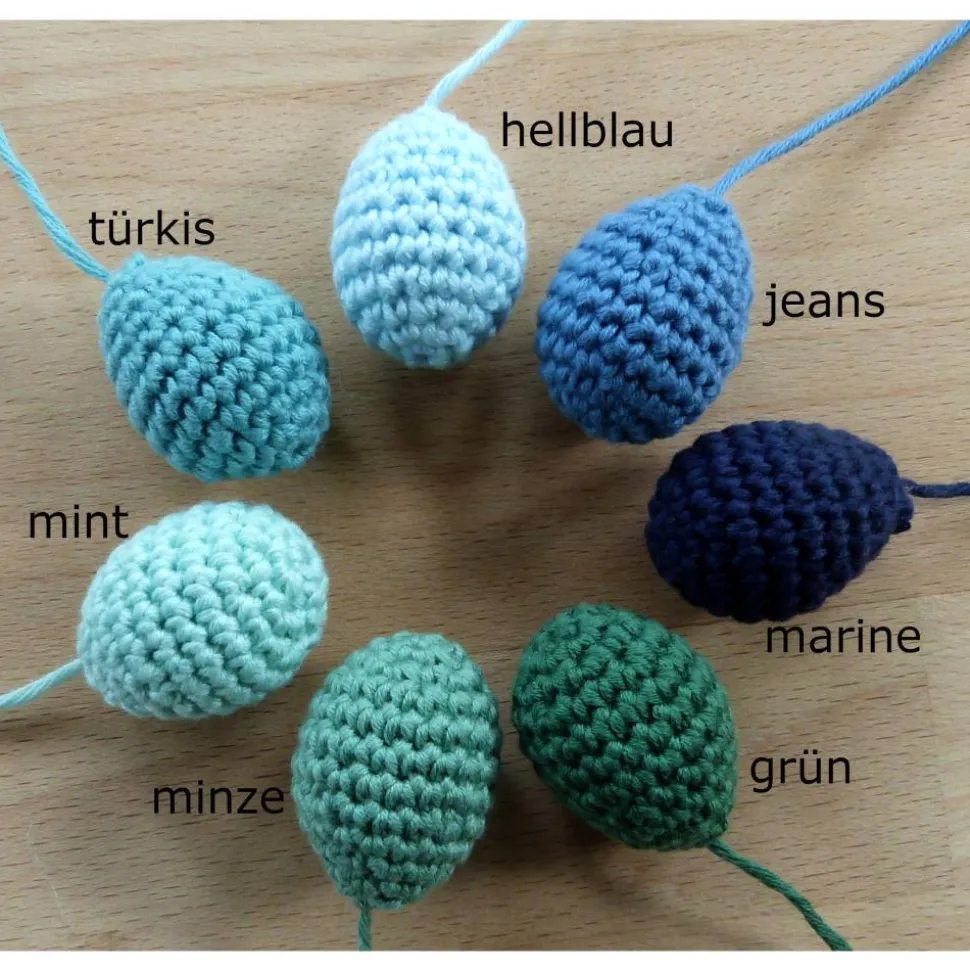 Hier habe ich für dich gehäkelte Eier-Anhänger aus Biobaumwolle (GOTS zertifiziert) in 29 verfügbaren Farben für die Dekoration von Haus oder Garten. Die Eier sind ca. 3,5 cm lang, 2,5 cm breit und haben ein Bändchen mit Schlaufe zum Aufhängen. Du kannst damit Wohnung, Balkon oder Garten dekorieren und Farbakzente setzen.