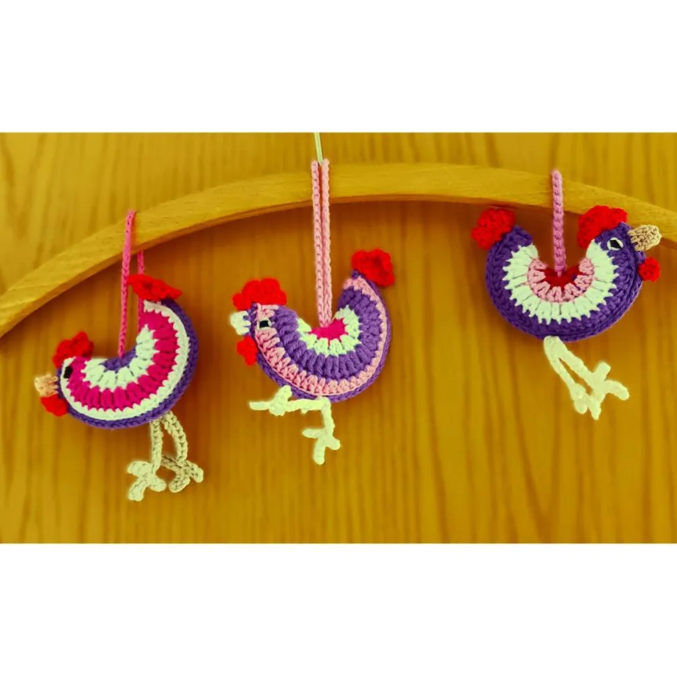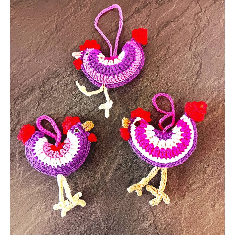 Drei Hühner für den Osterstrauß oder die Osterdeko am Fenster. Ein Ast genommen und mit einer Schnur beide Enden verbinden. Die Hühner darauf schieben. Schon ist die tolle Fensterdeko angebracht. Die drei Hühner sind ca 10 cm breit von Schnabel bis Schwanz und 10 hoch von Kamm bis zu den Zehenspitzen. Sie sind aus Baumwollgarn gehäkelt und mit Füllwatte gefüllt. Ich habe hier rosa mit lila und weiß ausgetauscht. Gleiche Farben und doch ganz unterschiedliche Wirkung