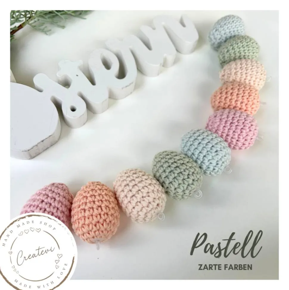 Dieses Set aus zehn pastellfarbenen gehäkelten Ostereiern bringt eine ruhige, frühlingshafte Stimmung in deine Osterdekoration. Die handgefertigten Ostereier bestehen aus stabilen Kunststoffeiern, die sorgfältig mit 100 % Baumwollgarn umhäkelt sind. Dadurch entsteht eine langlebige und wiederverwendbare Osterdeko, die du jedes Jahr erneut einsetzen kannst.