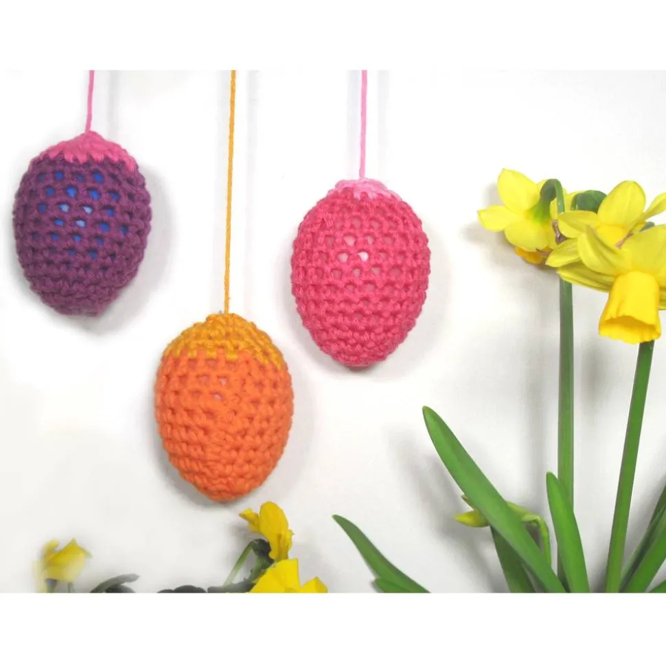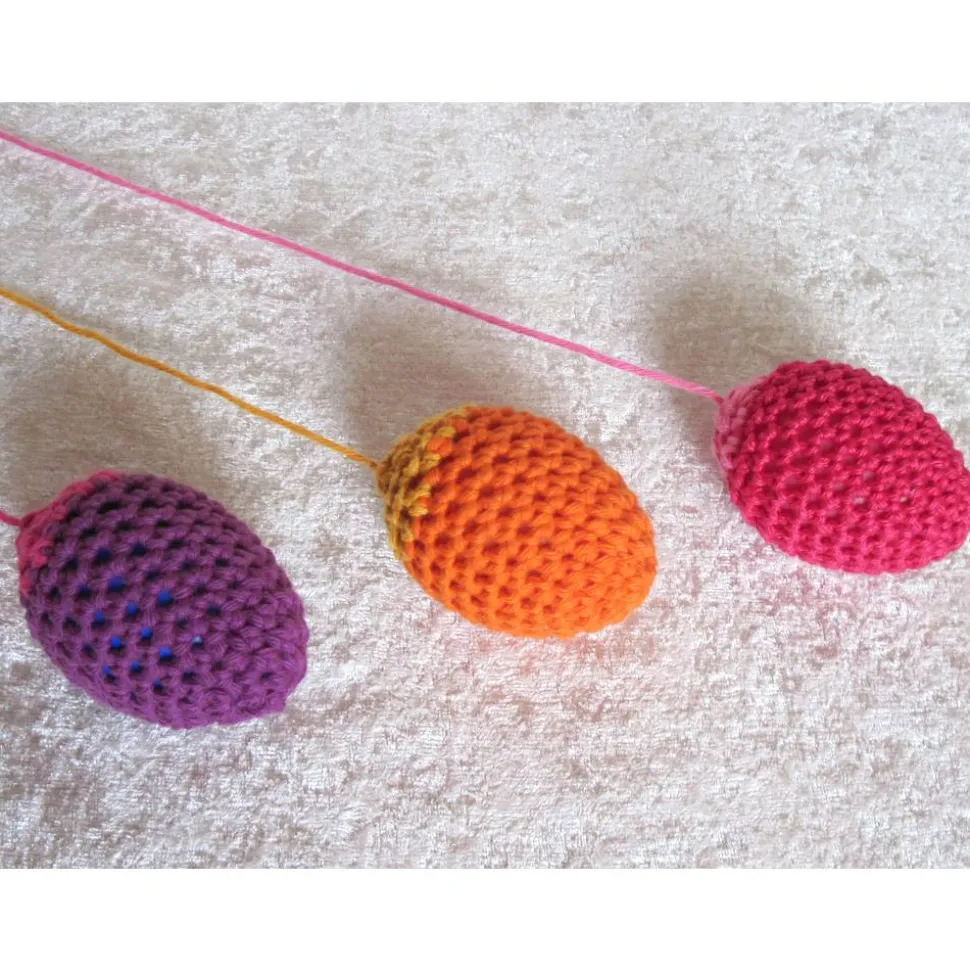 Bringen Sie Farbe und Freude in ihre Osterdekoration mit diesem Set aus sechs gehäkelten Ostereiern zum Aufhängen. Jedes Ei ist liebevoll in festen Maschen gehäkelt und besticht durch seine fröhlichen Farben: türkis, violett mit pink, grün, pink mit rosa, blau und orange mit ocker. Jedes Ei besteht aus einem umhäkelten Kunststoff-Ei und ist 7 cm hoch sowie 5 cm breit.