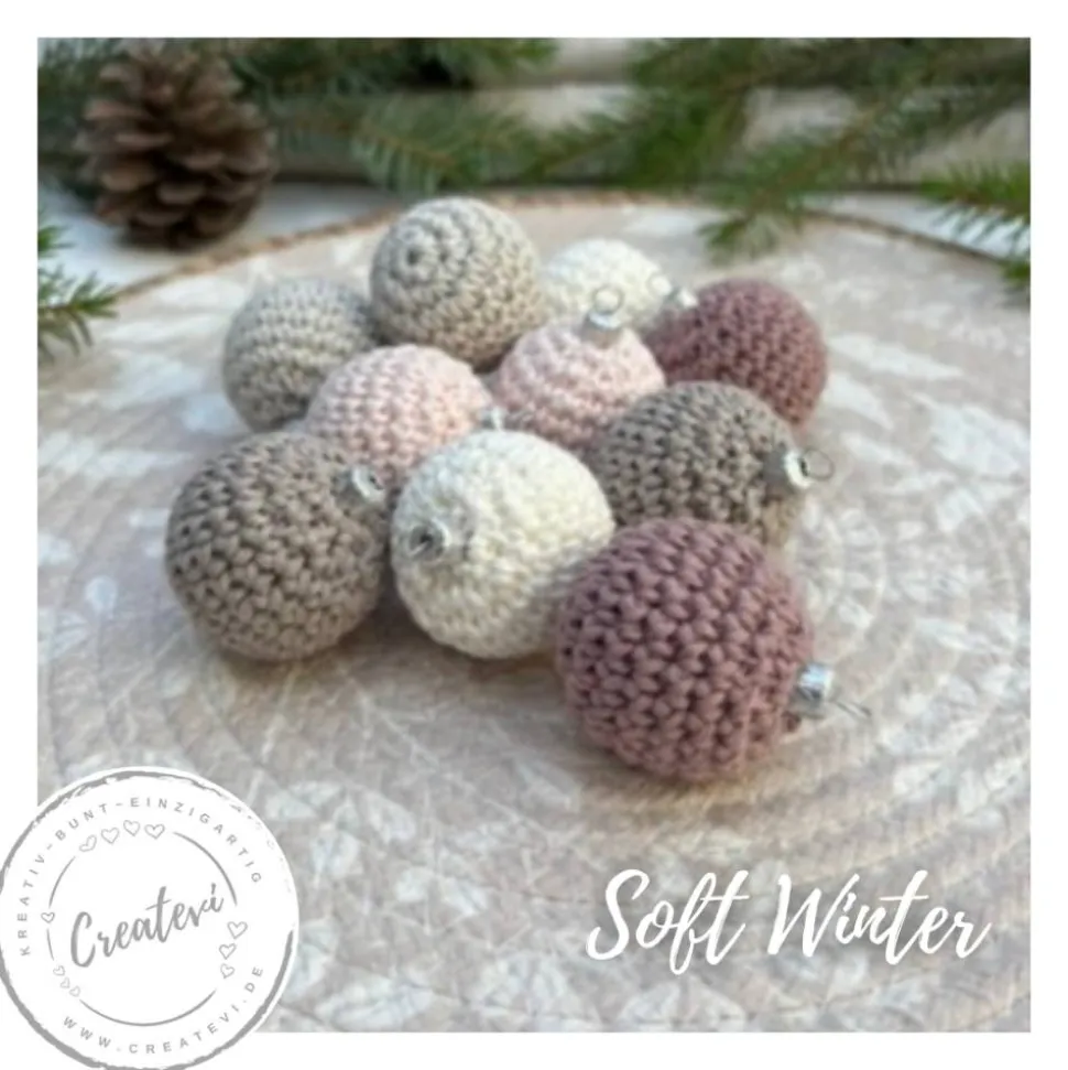 Sichere dir jetzt dein Set aus 10 gehäkelten Weihnachtskugeln in der Farbkollektion „Soft Winter“. Handarbeit, langlebige Qualität und kostenlose Lieferung – für eine festliche und stilvolle Weihnachtszeit.
