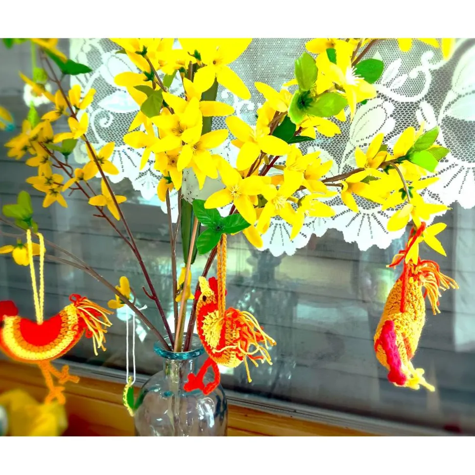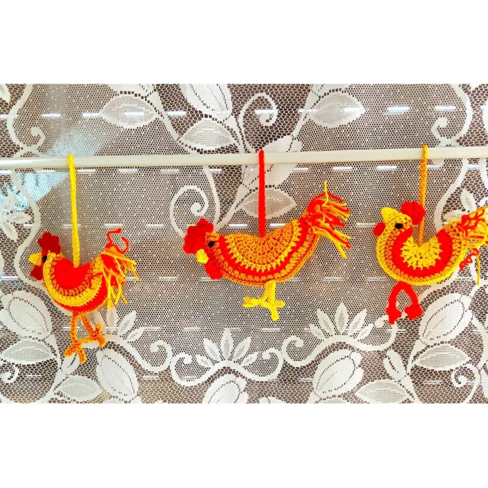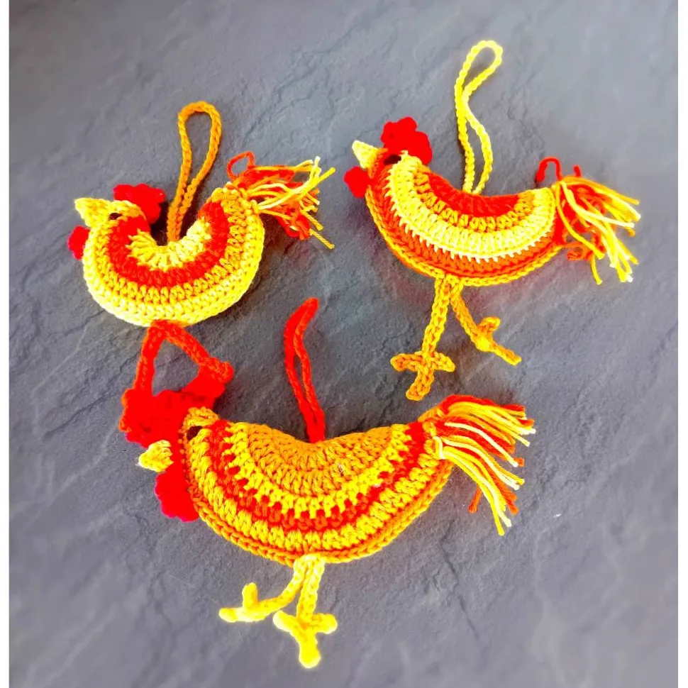 Einmaliges von mir in Handarbeit gehäkeltes Set aus 3 Hühnern für die Osterdeko, Frühlingsdeko. Sie finden an einem Osterstrauß genauso ihren Platz wie an einer Wohnzimmerpflanze. Die Farben sind bei den 3 Hühnern gleich, aber in anderer Reihenfolge habe ich das Senfgelb, orange und gelb gewählt. So bleibt jedes Huhn ein Unikat. Sie sind aus Baumwolle gefertigt.Mit Füllwatte gefüllt, gibt es einen tollen 3D Effekt. Die Größen weichen ein wenig voneinander ab. Sie sind zwischen 7 – 12 cm breit.