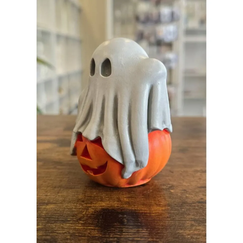 Der kleine Geist auf einem Kürbis wurde handbemalt und ist ca. 6,5×6,0x8,5 cm groß (B/LH)
