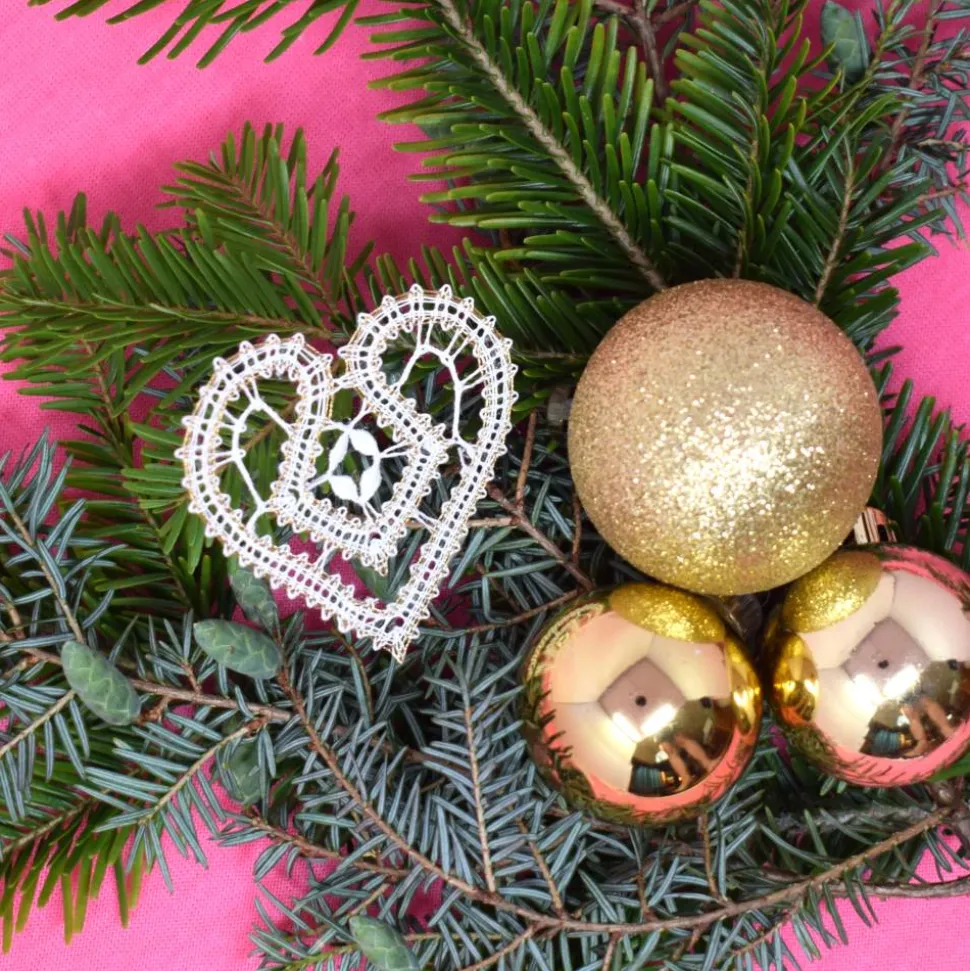 Verleihe deinem Weihnachtsbaum einen besonderen Glanz mit dem geklöppelten Christbaumschmuck Herz 1. Dieses elegante Herz aus feiner Spitze besticht durch seine liebevolle Handarbeit und die harmonische Farbkombination in weiß-gold. Mit einer Höhe von 6 cm und einer Breite von 6 cm ist dieses Schmuckstück ideal als Akzent an deinem Christbaum, Adventskranz oder als stilvolle Fensterdekoration.