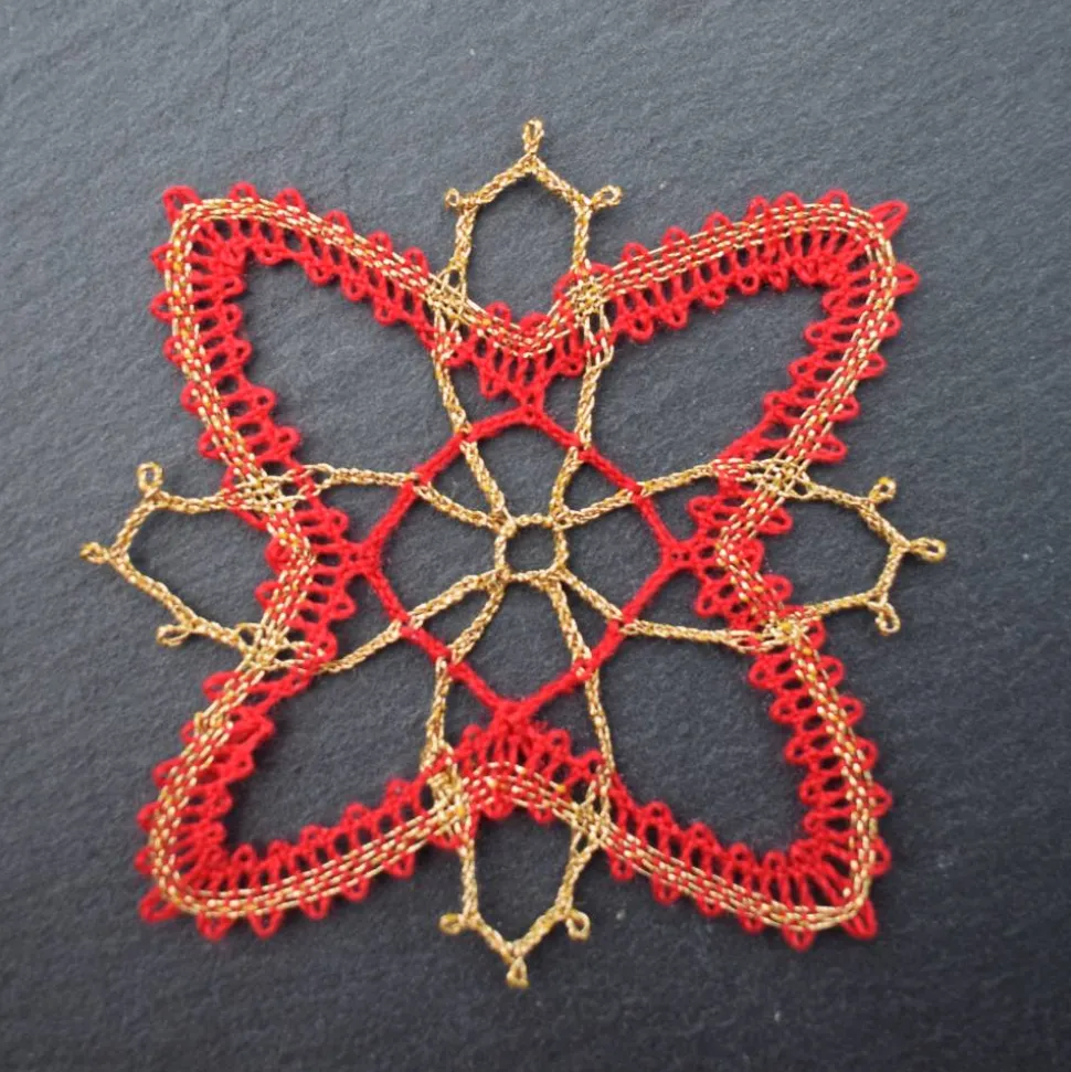 Verleihe deinem Weihnachtsbaum einen einzigartigen, edlen Look mit dem geklöppelten Christbaumschmuck Ornament 2 in Rot-Gold.