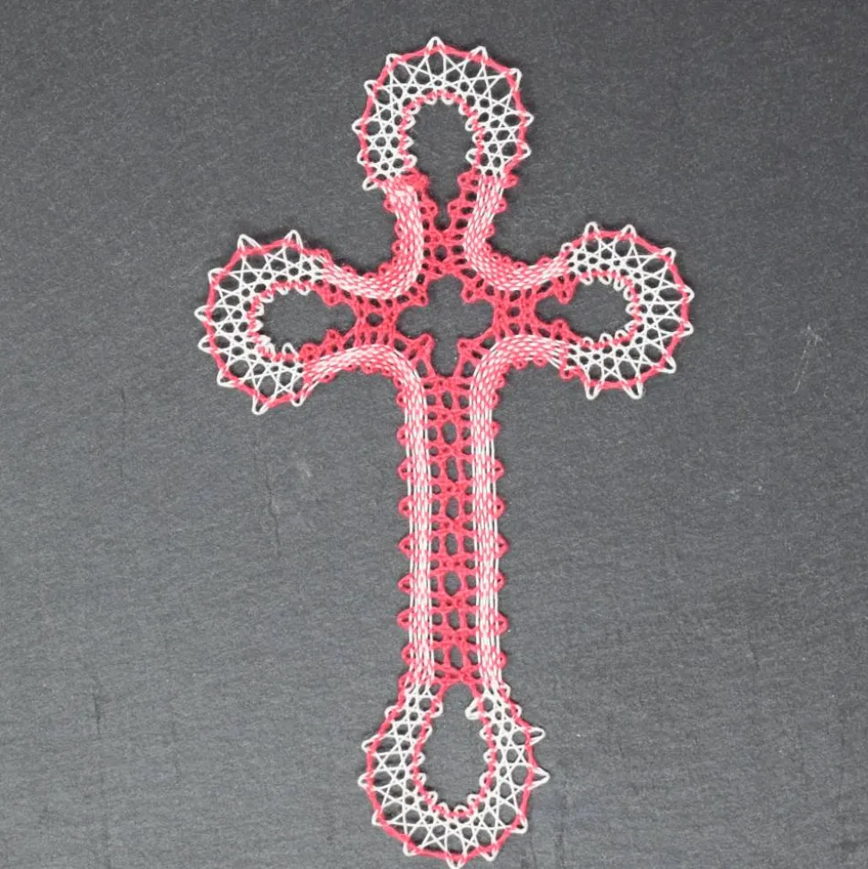 Das geklöppelte Kreuz wird mit einer farblich passenden Karte geliefert, sodass du es perfekt als Geschenk oder zur Dekoration nutzen kannst. Die hochwertige Verarbeitung und das traditionelle Handwerk machen dieses Kreuz zu einem besonderen Hingucker.