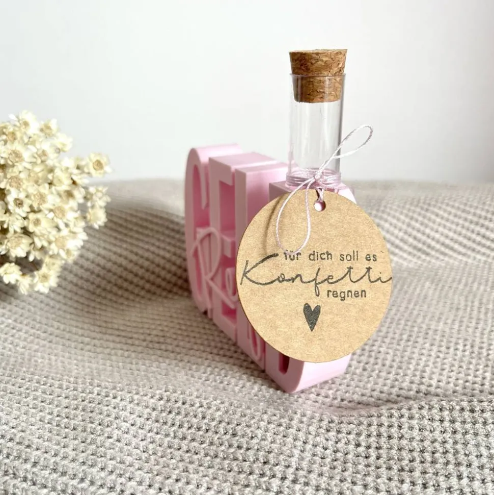 Als besonderes Highlight ist am Schriftzug ein liebevoll gestalteter Anhänger befestigt, auf dem steht: „für dich soll es Konfetti regnen“. So wird dein Geschenk zu etwas ganz Besonderem und eignet sich perfekt für Geburtstage, Hochzeiten oder andere Anlässe.