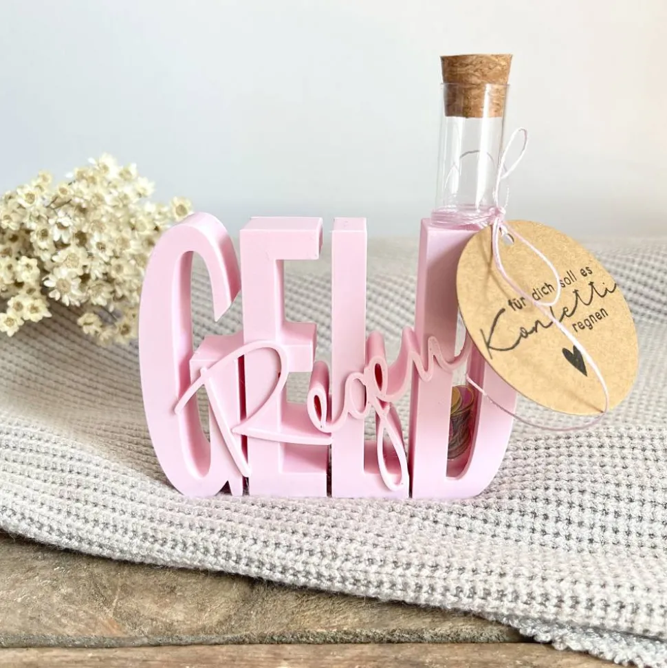 Du suchst nach einer kreativen und liebevollen Verpackung für ein Geldgeschenk? Mit Geld Regen verschenkst du nicht nur Geld, sondern zauberst auch ein Lächeln ins Gesicht des Beschenkten. Der Schriftzug, wahlweise in rosa, cremeweiß oder schwarz, wird durch ein eingelassenes Reagenzglas ergänzt, das mit einer Portion Konfetti gefüllt ist. Hier kannst du ganz einfach deinen gerollten Geldschein hineinlegen. Ein Tipp: Mit einem dünnen Bändchen lässt sich der Schein noch leichter wieder herausziehen.