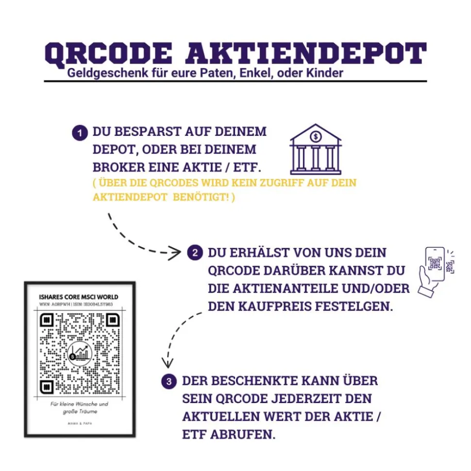 ❤️️ Du besparst in deinem Depot bereits eine Aktie, einen ETF, oder eine Kryptowährung? Oder du möchtest jetzt mit dem besparen für dein Kind, Enkelkind, Patenkind beginnen? Mit dieser QrCode Sparbuch Bild, kannst du die Aktie, ETF, Kryptowährung symbolisch verschenken.