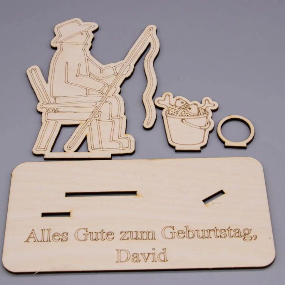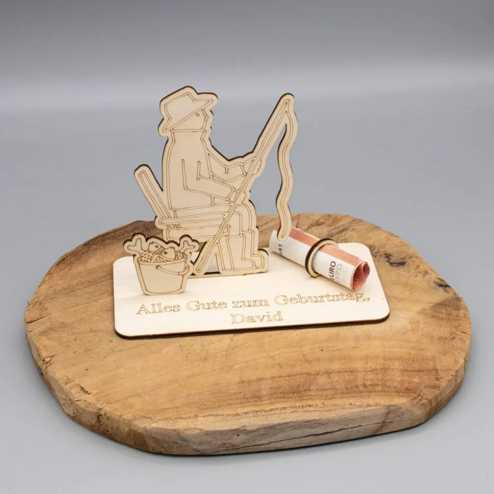 Schenken Sie Ihren Liebsten ein Stück Natur, Kunst und Herzlichkeit mit unserem exquisiten, personalisierten Geldgeschenk aus Holz mit Angler-Motiv. Ein Erlebnis, das sowohl die Schönheit der Natur als auch die Einzigartigkeit des Beschenkten feiert.