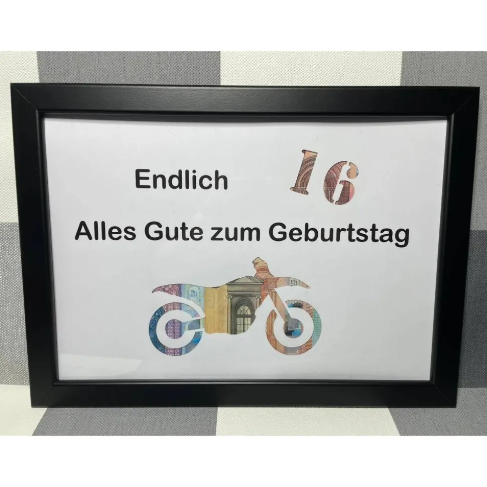 Geldgeschenk Bilderrahmen Geburtstag 16 Motorrad personalisierbar DIN A4