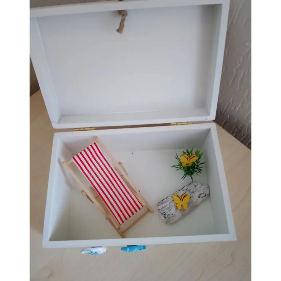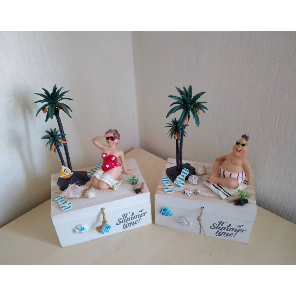 Die weiße Holzbox ist mit dem Aufdruck It´s Summertime versehen und wurde von Hand mit einer Figur, Palme, Fischen, Muscheln, Grasbüscheln und Treibholz gestaltet. Im Inneren erwartet dich weitere detailreiche Dekoration, sodass die Box auch als wunderschöne Schatztruhe für Geldscheine oder kleine Überraschungen dient.