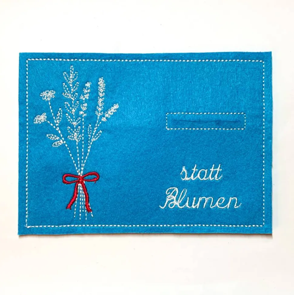 In diesem genähten und bestickten Briefumschlag aus Filz kannst du stilvoll ein Geldgeschenk oder eine kleine Nachricht überreichen. Das türkisfarbene Design mit liebevoll gesticktem Blumenstrauß macht jeden Anlass besonders – egal ob Geburtstag, Hochzeit, Jubiläum oder einfach als Dankeschön.