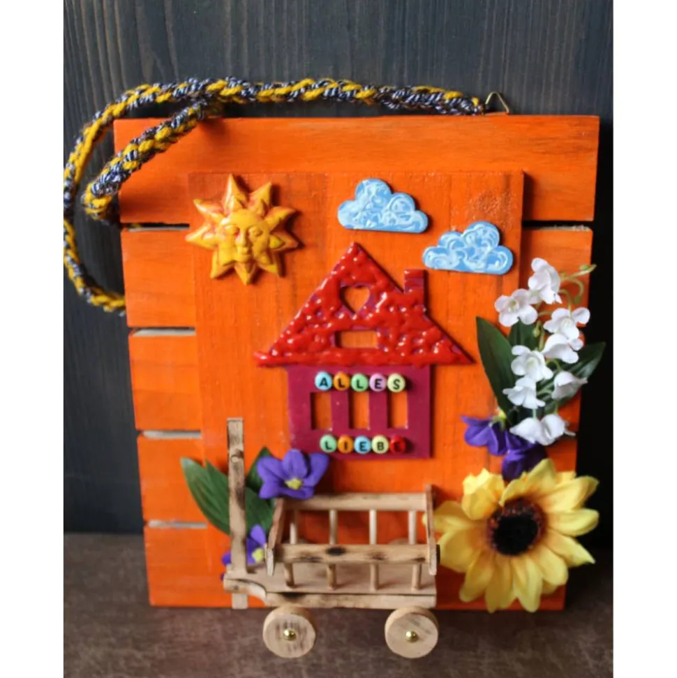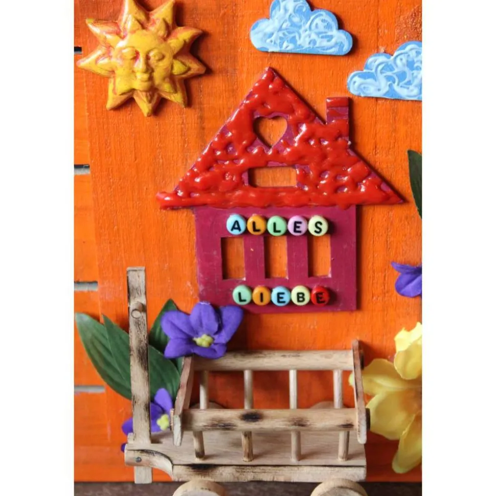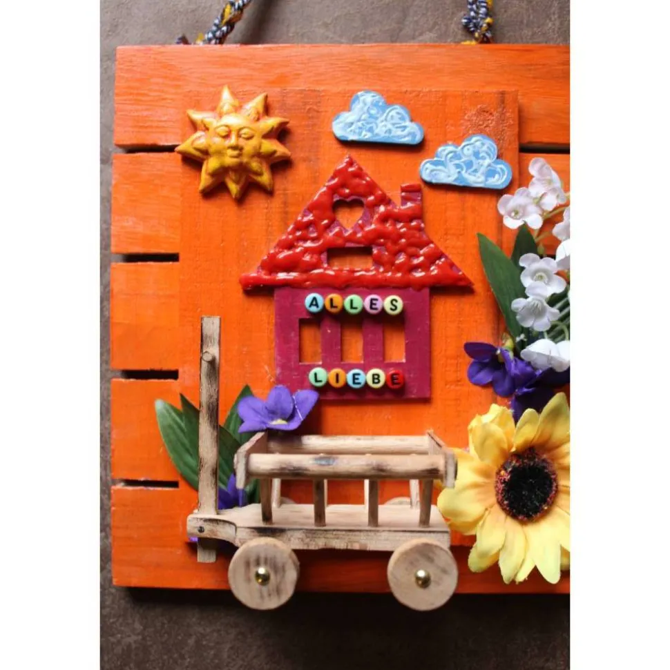 Auf Holz gestaltete Collage. Mit Applikationen aus Holz, Ton und Kunststoff, gestaltet mit Acrylfarben. Der Schriftzug ALLES LIEBE ist mit kleinen Buchstabenperlen am Häuschen angebracht.