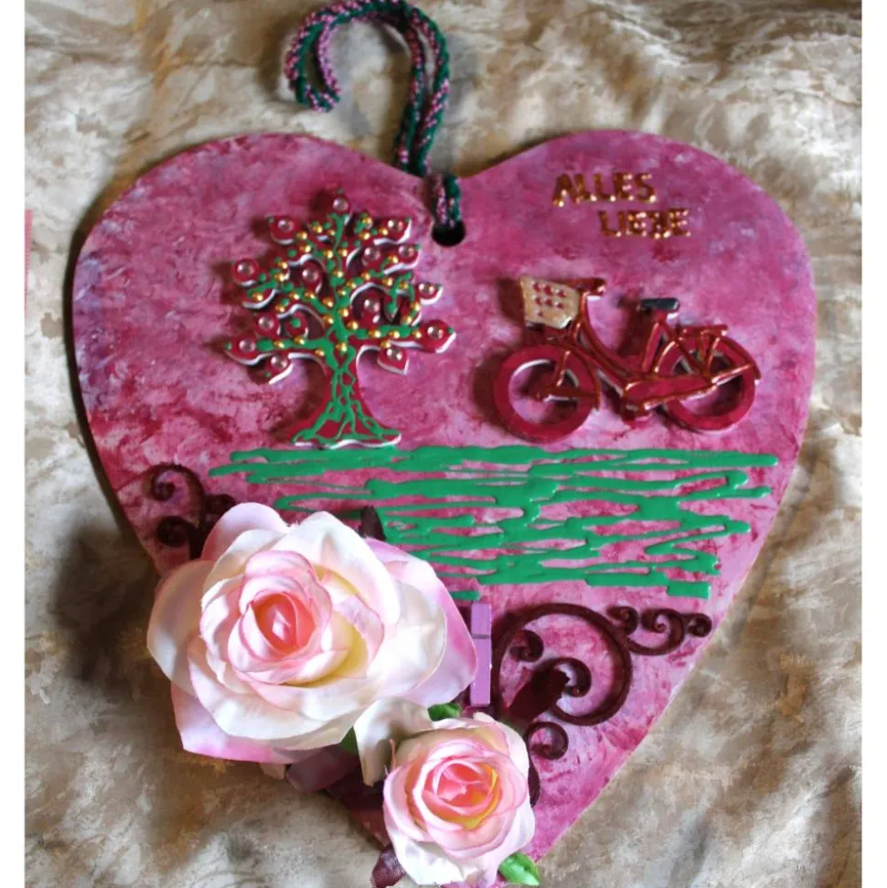 Collage, abstrakt gestaltet auf einem herzförmigen Bambusbrett. Bemalt im angesagten Shabby-Stil.